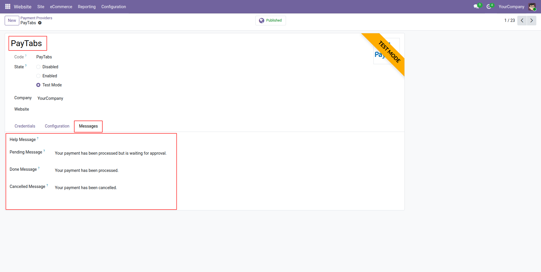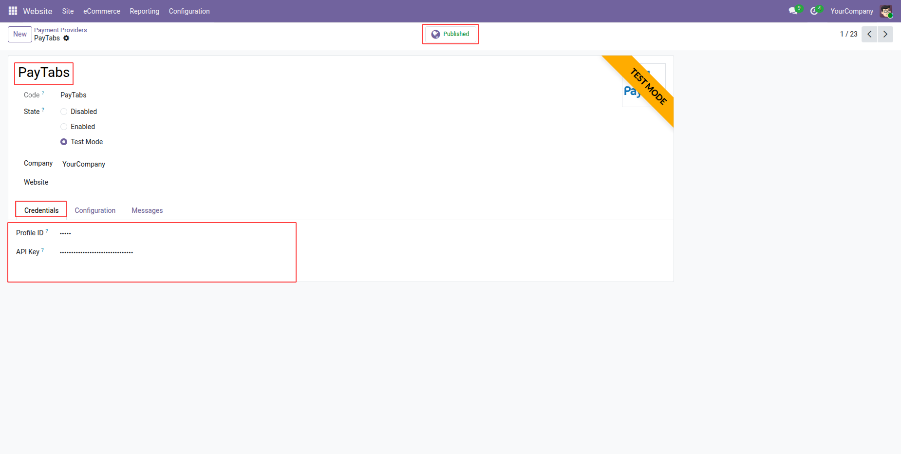 Go to Website -> Configuration -> Payment Providers to access Paytabs settings.