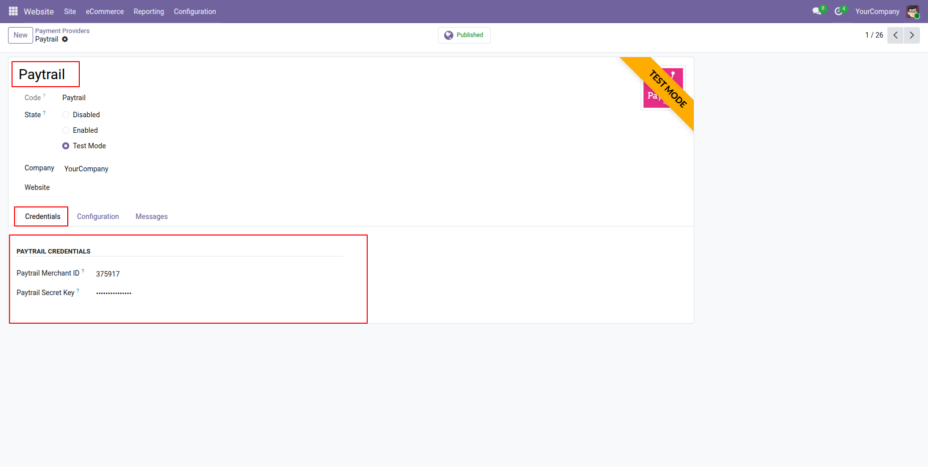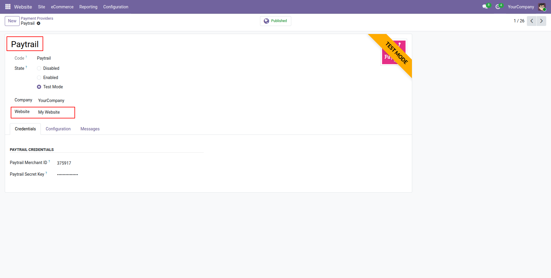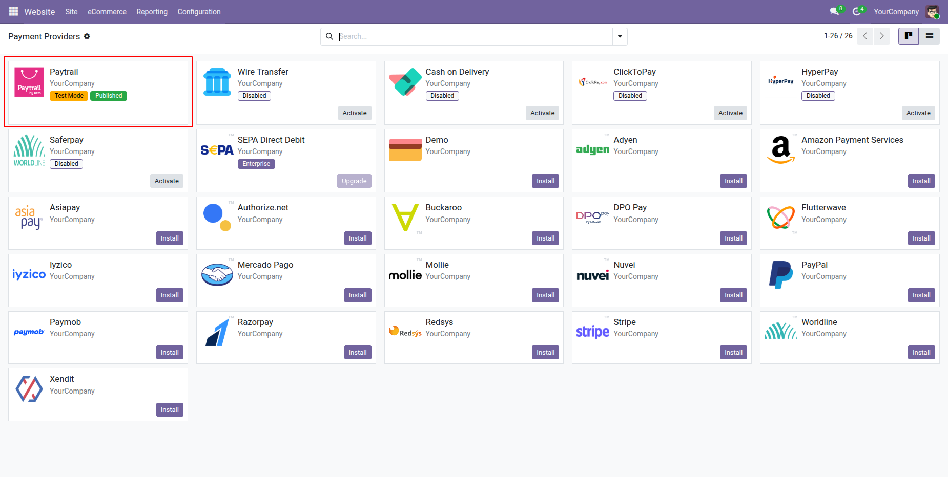 Go to Website -> Configuration -> Payment Providers to access Paytrail settings.