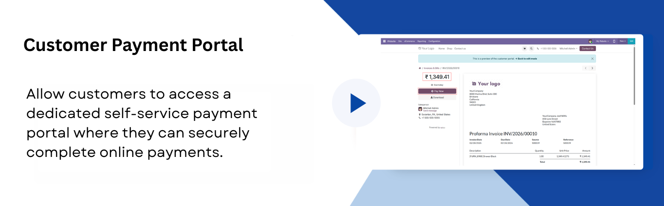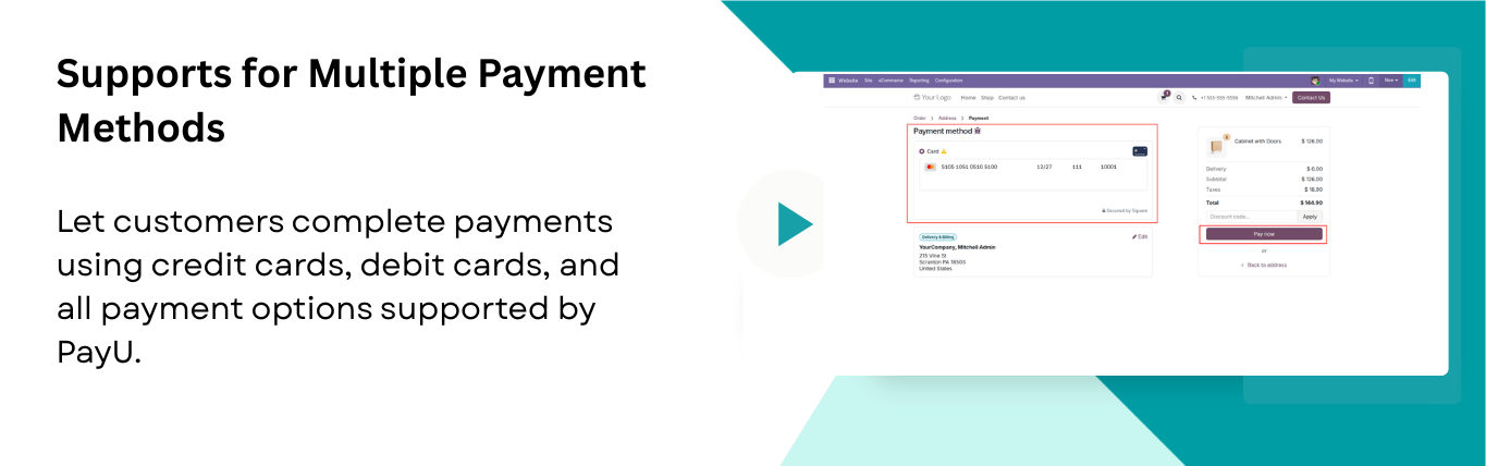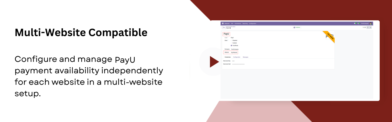 The PayU Payment Provider module seamlessly integrates your Odoo store with the PayU payment gateway, enabling fast and secure online payments through supported credit/debit cards and other PayU payment methods. It enhances the checkout experience with customizable payment status messages and automatic notifications, while offering full multi-website compatibility so each site can manage its own payment settings. The module also supports processing refunds directly from Odoo for smoother cancellations, maintains complete transaction history for easy tracking. Additionally, customers can securely pay through a dedicated self-service payment portal, ensuring a reliable and convenient payment experience for your e-commerce business.