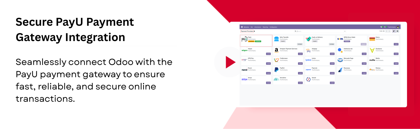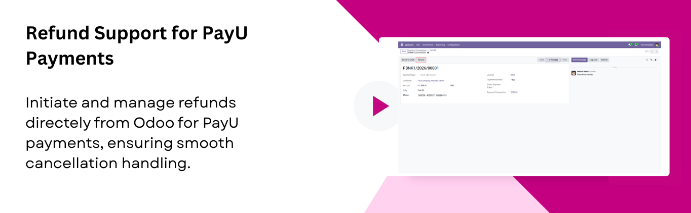 The PayU Payment Provider module seamlessly integrates your Odoo store with the PayU payment gateway, enabling fast and secure online payments through supported credit/debit cards and other PayU payment methods. It enhances the checkout experience with customizable payment status messages and automatic notifications, while offering full multi-website compatibility so each site can manage its own payment settings. The module also supports processing refunds directly from Odoo for smoother cancellations, maintains complete transaction history for easy tracking. Additionally, customers can securely pay through a dedicated self-service payment portal, ensuring a reliable and convenient payment experience for your e-commerce business.