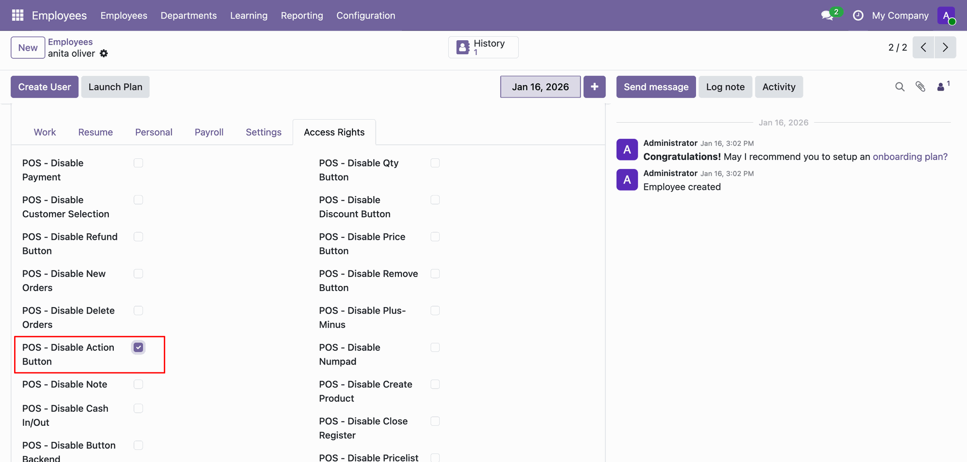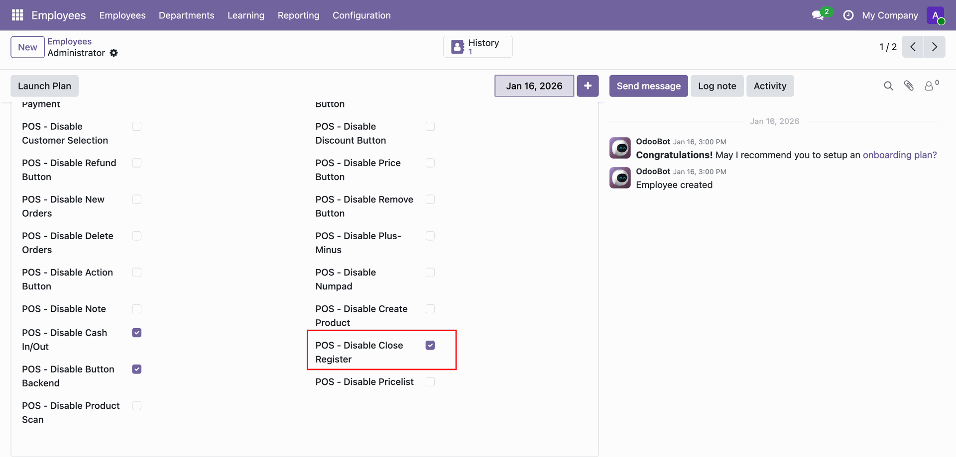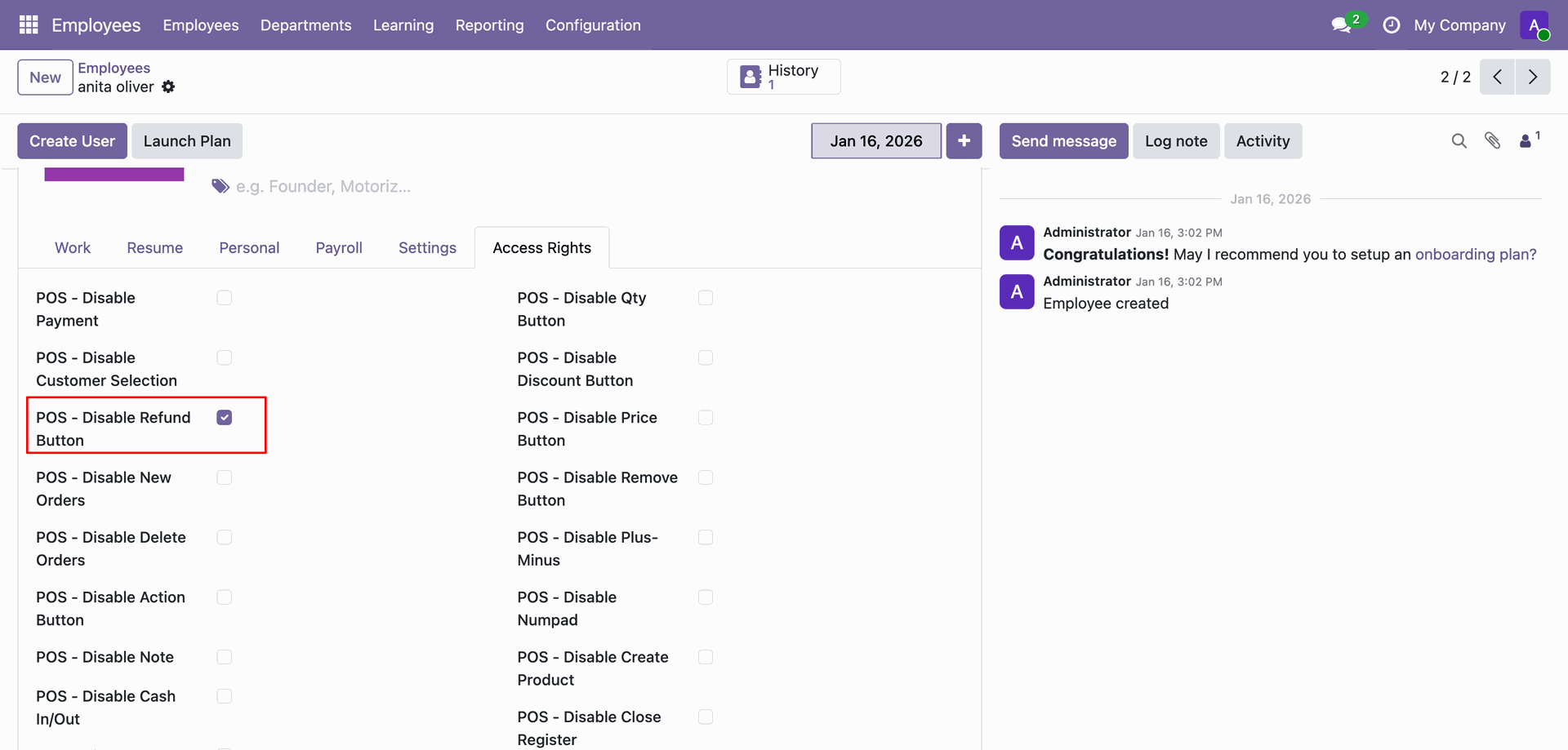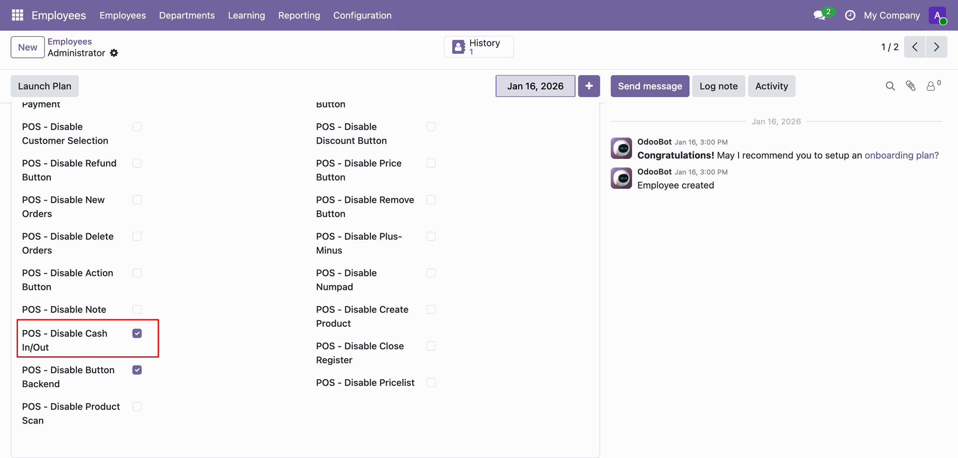 You can easily manage specific access for a particular cashier from the employee form view. Tick the tickbox to disable that access rights.