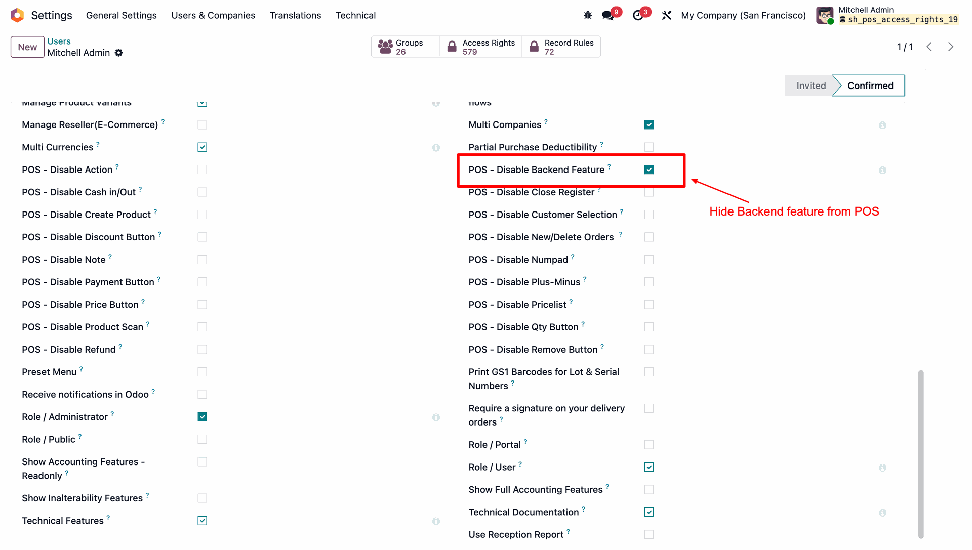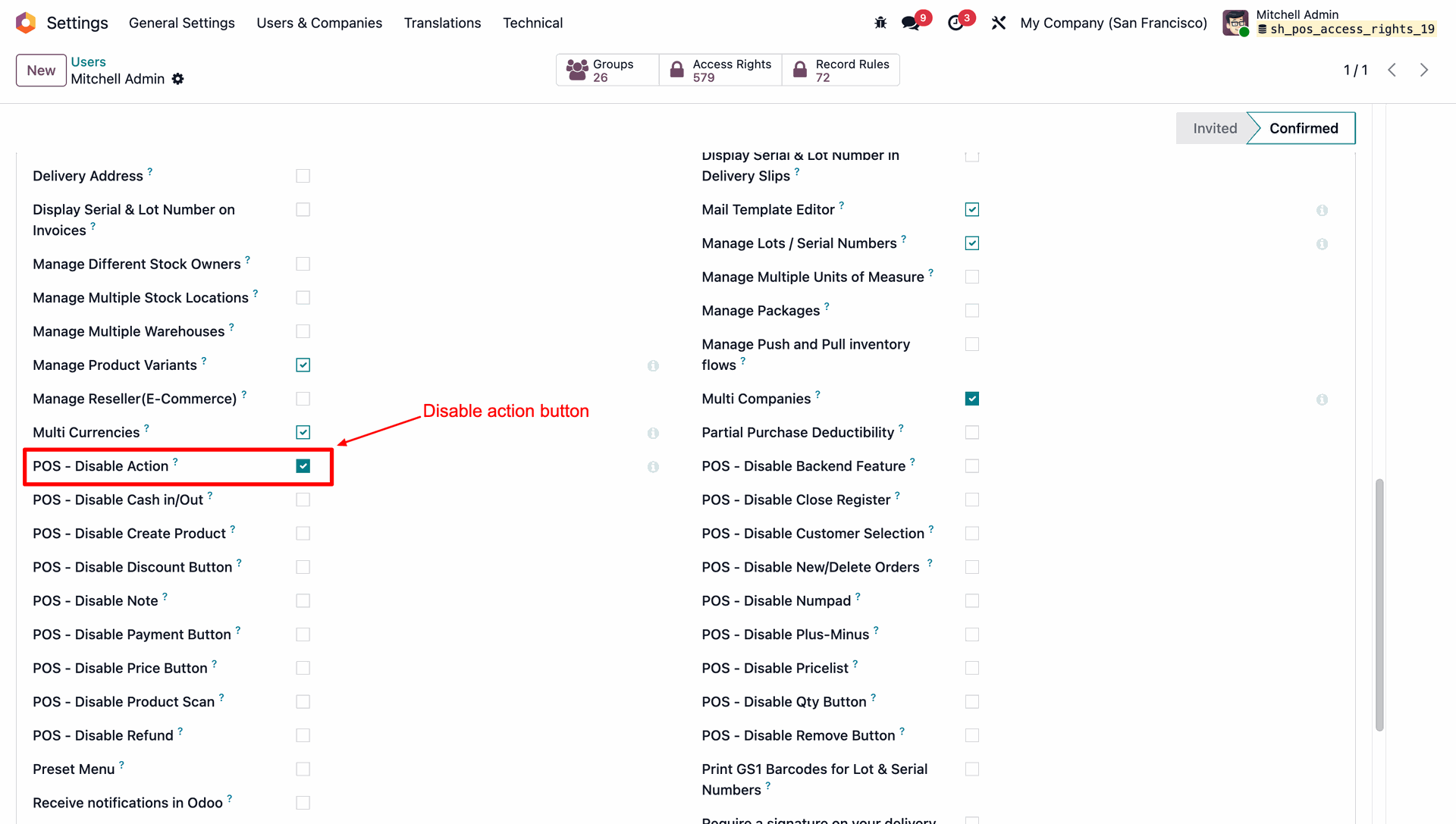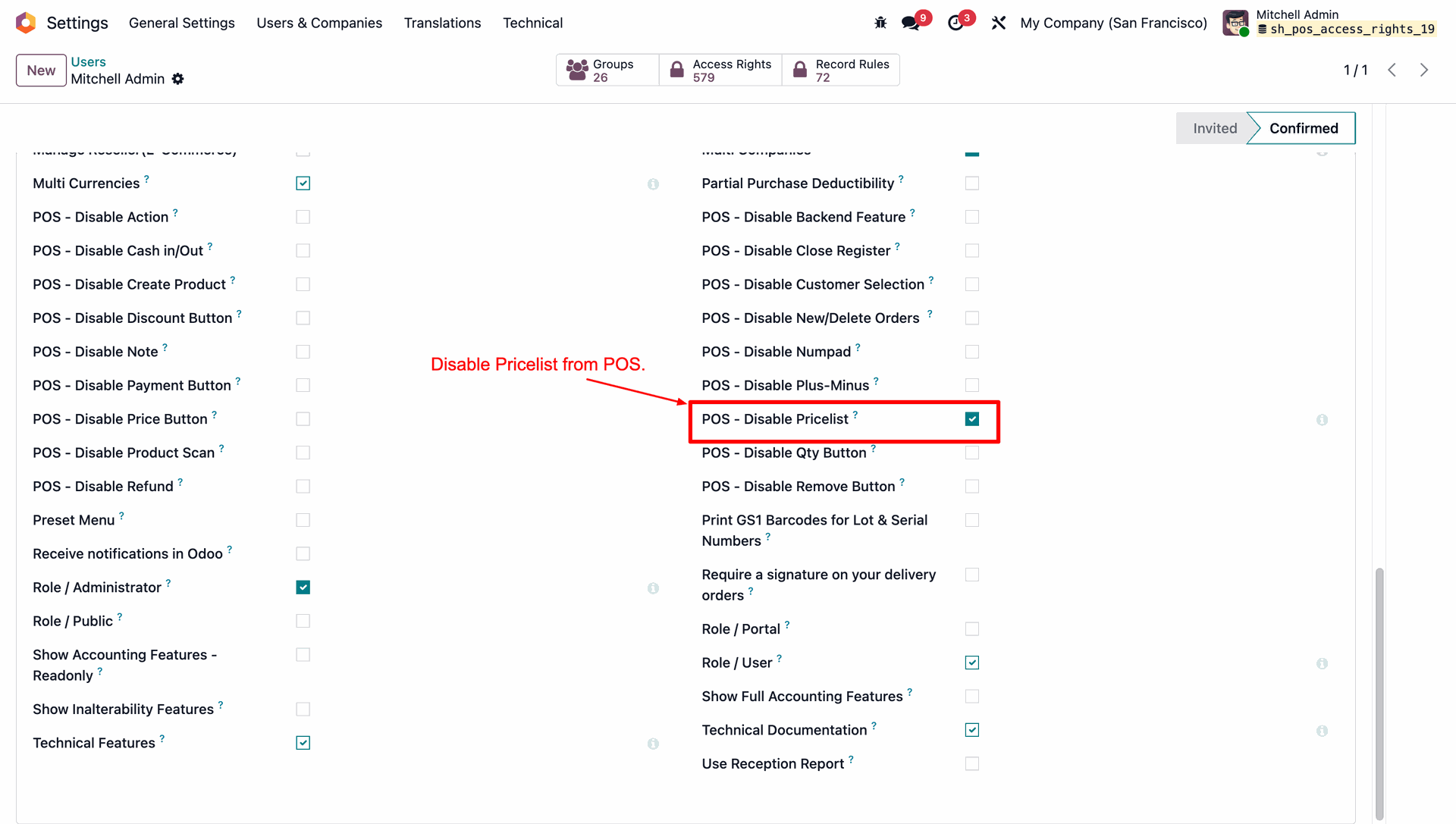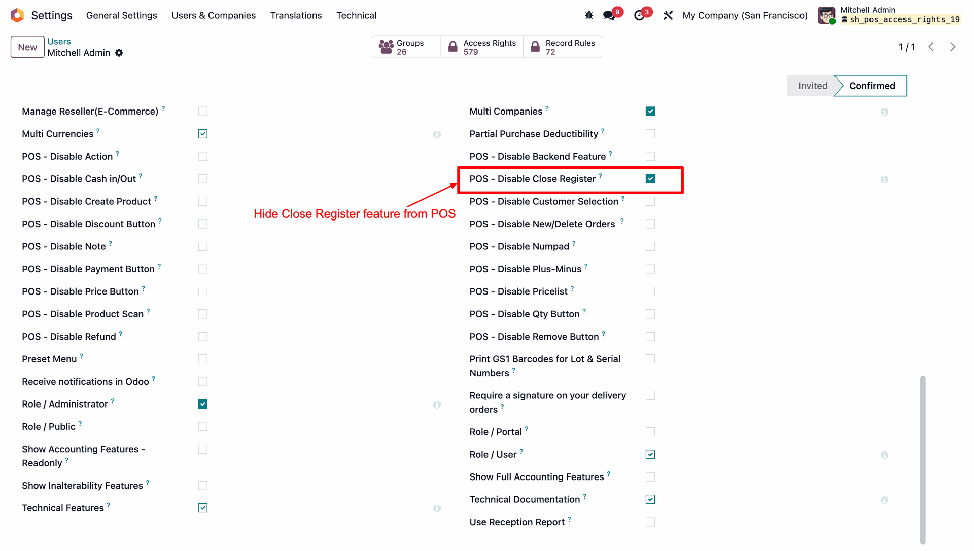 Allows you to control POS behavior by disabling specific options such as Actions, backend access, cash in/out, closing register, product creation, notes, pricelists, product scanning, and refunds.