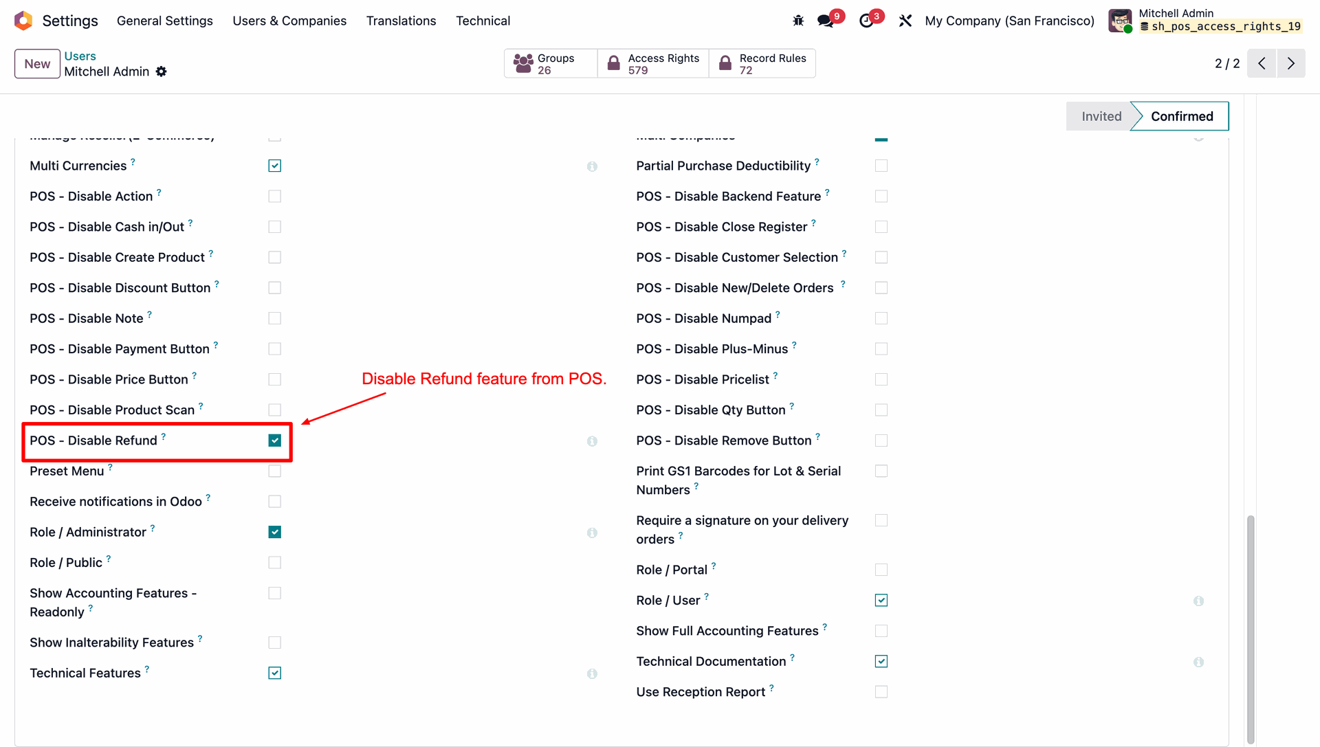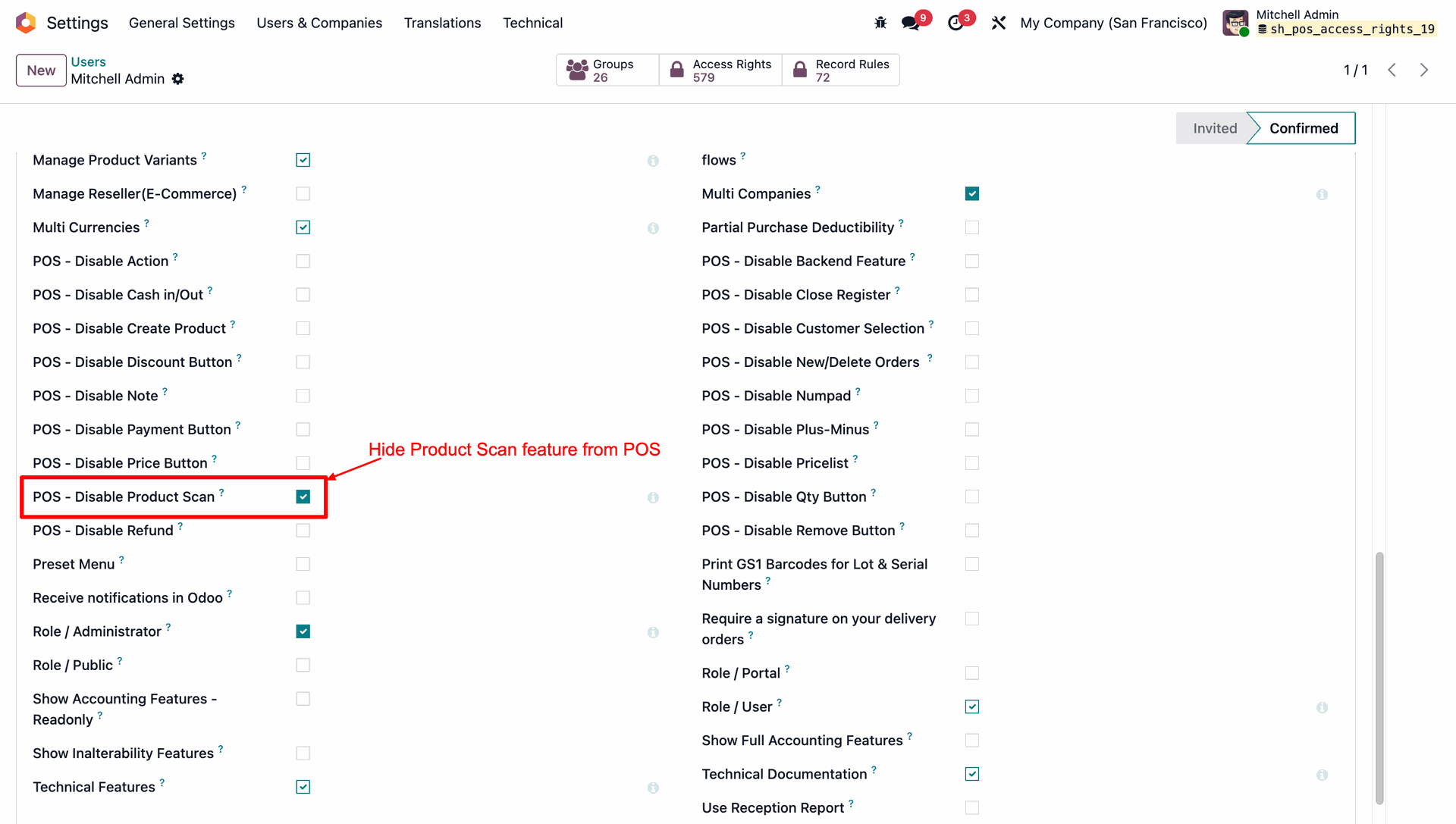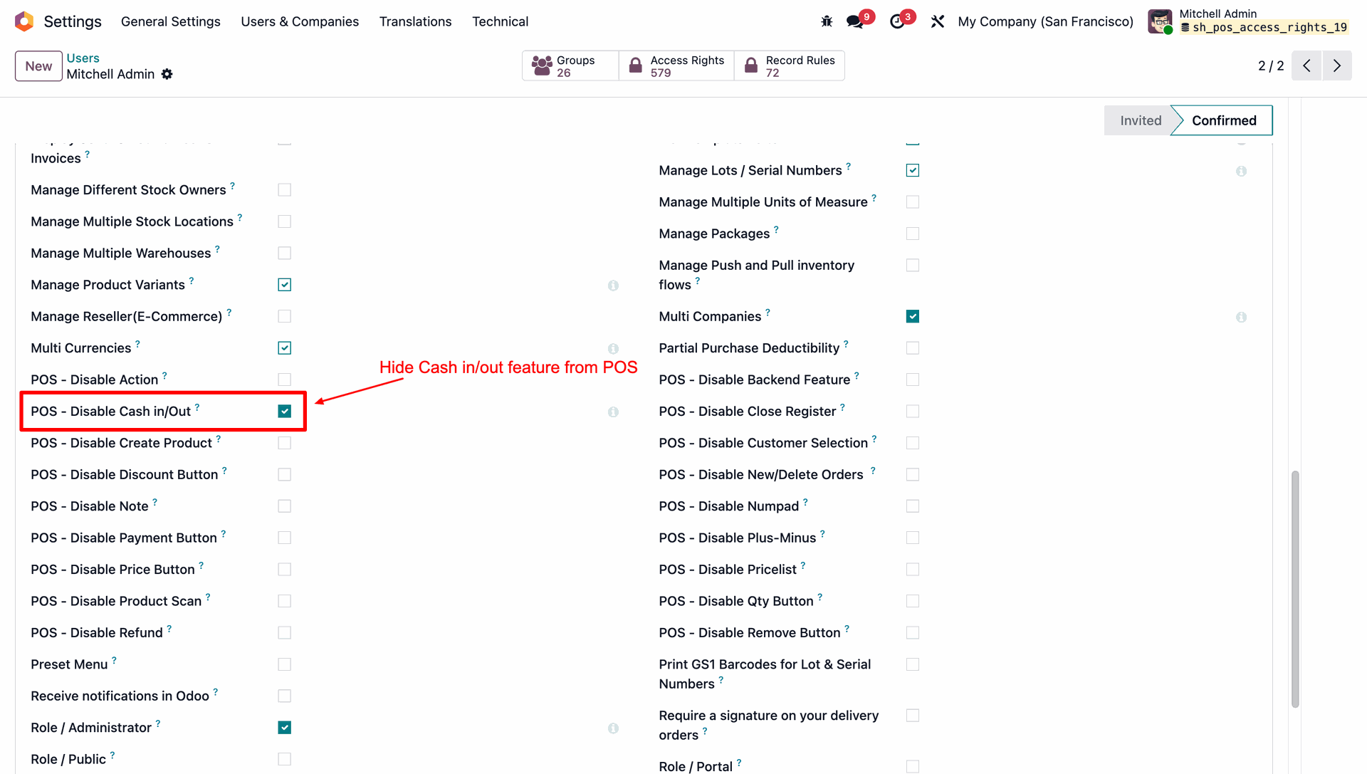Allows you to control POS behavior by disabling specific options such as Actions, backend access, cash in/out, closing register, product creation, notes, pricelists, product scanning, and refunds.