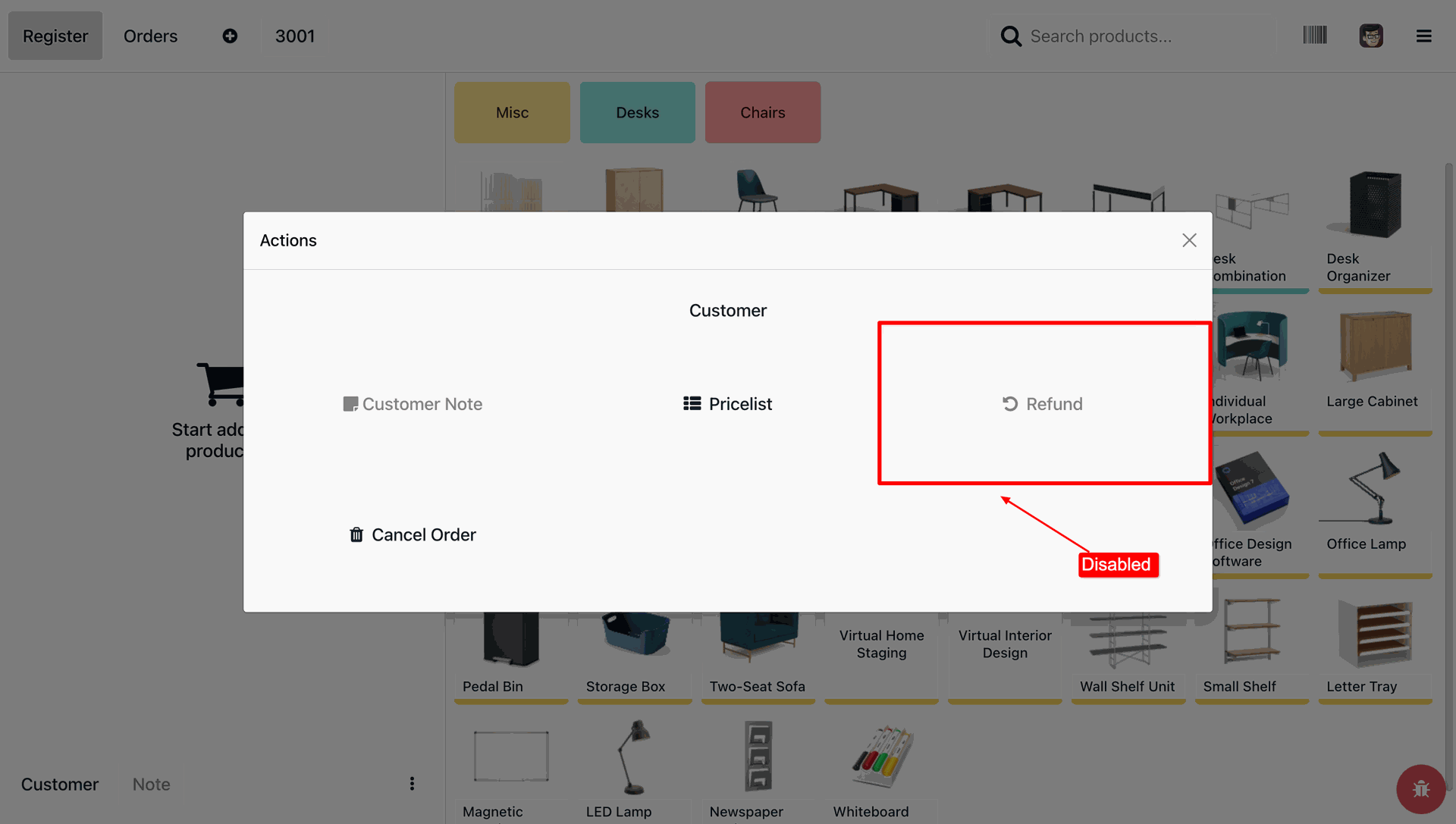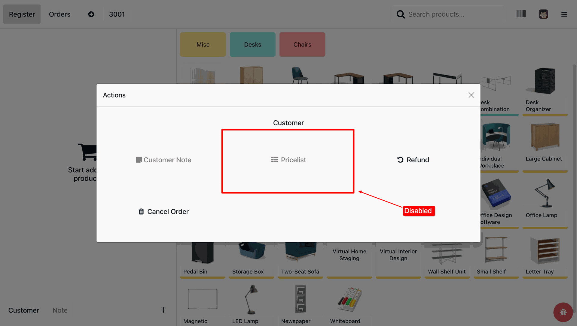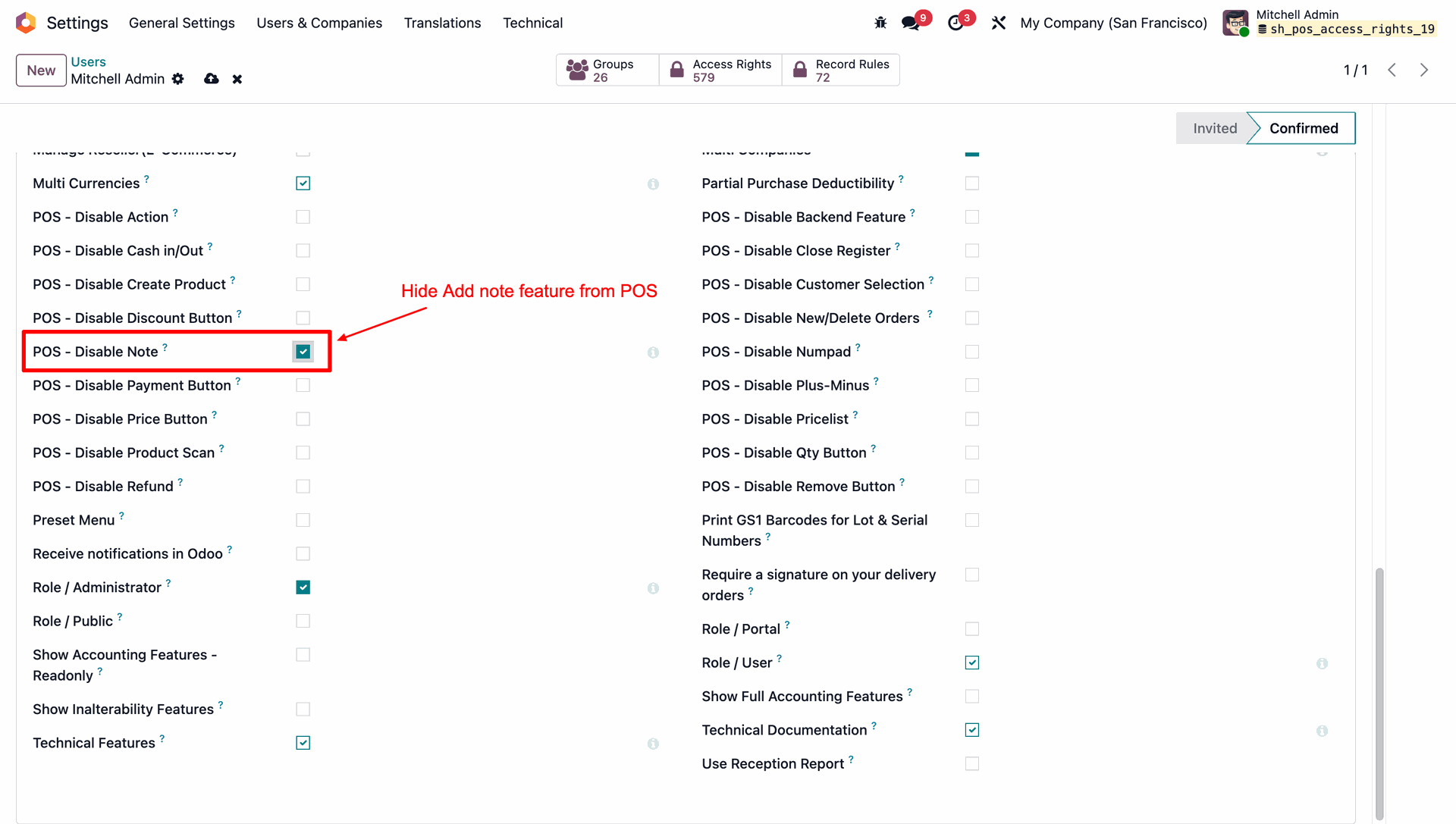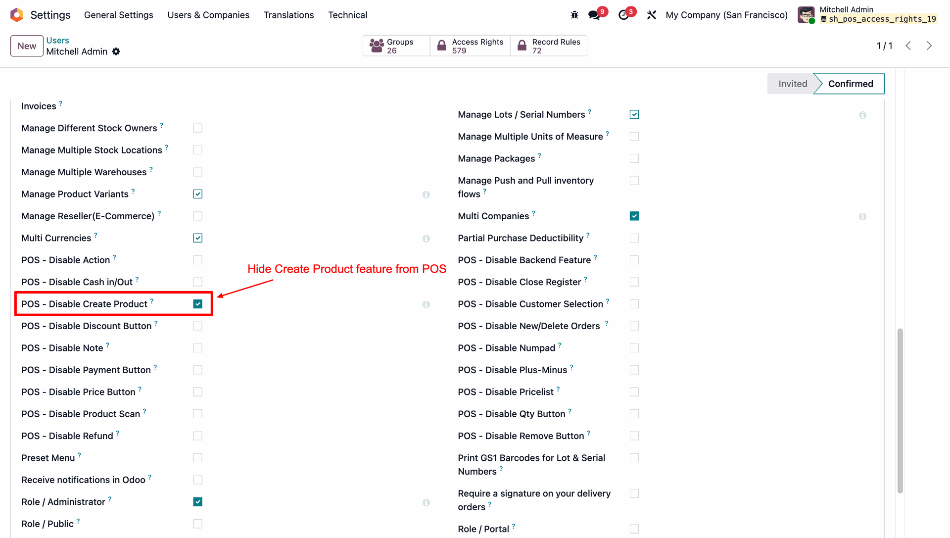 Allows you to control POS behavior by disabling specific options such as Actions, backend access, cash in/out, closing register, product creation, notes, pricelists, product scanning, and refunds.
