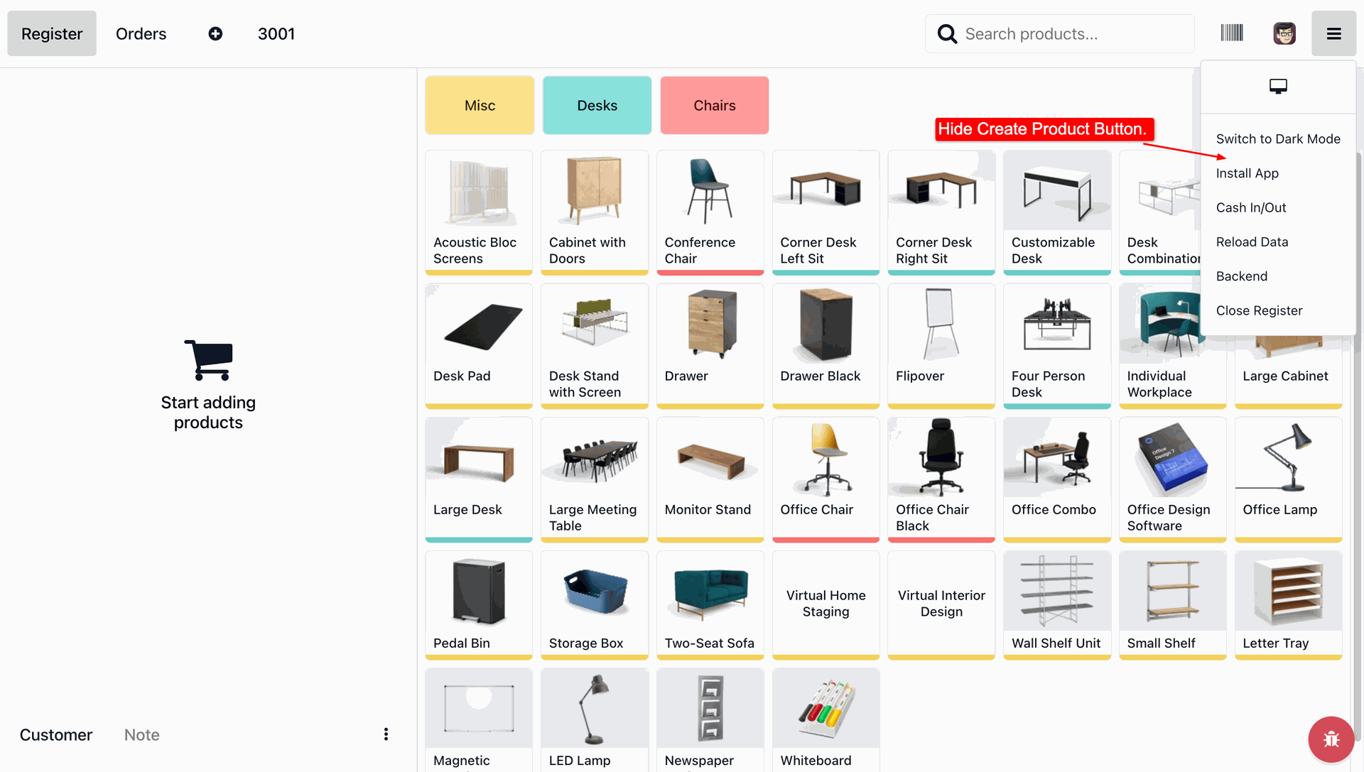 The Create Product option is now hidden.