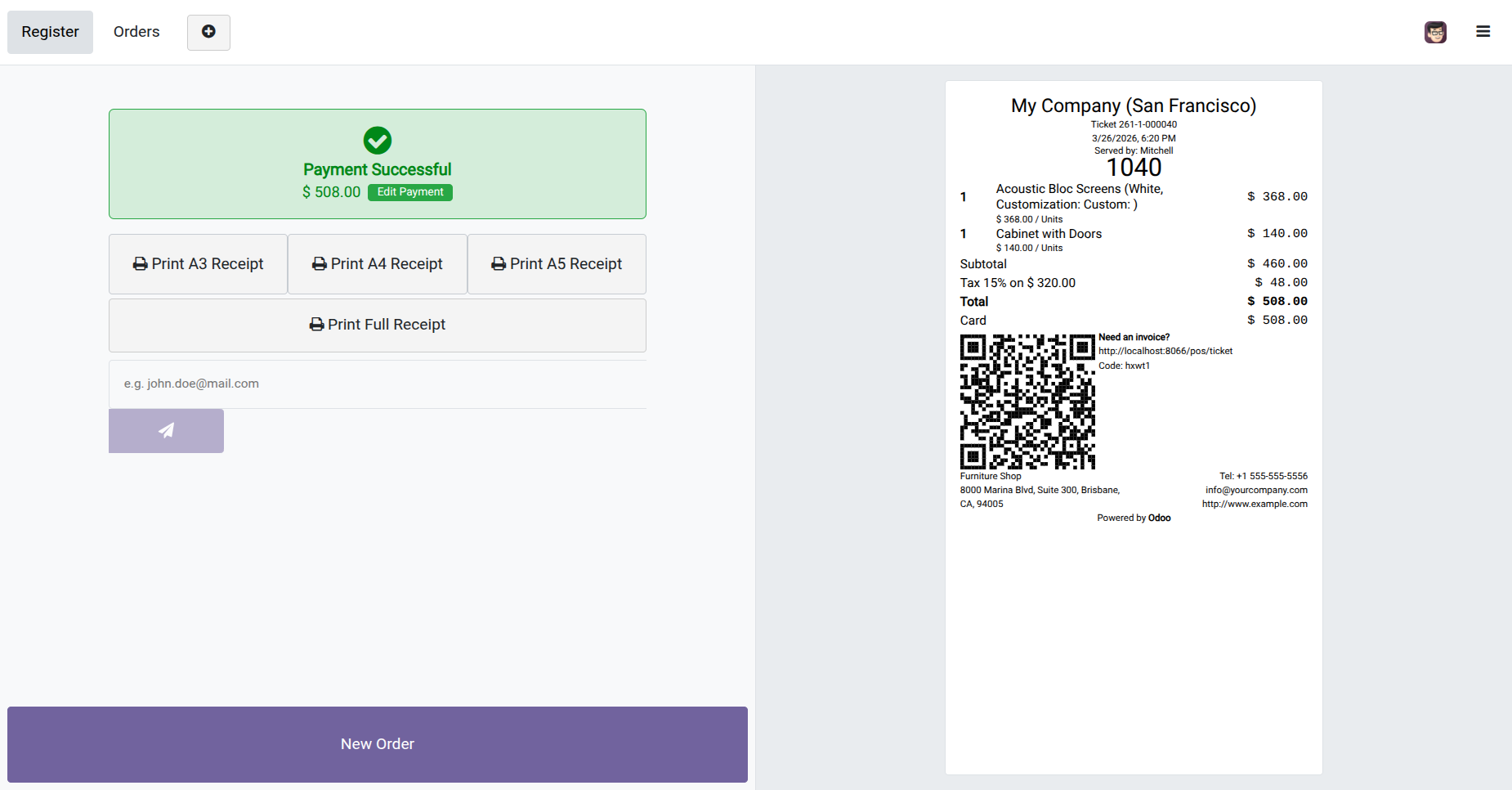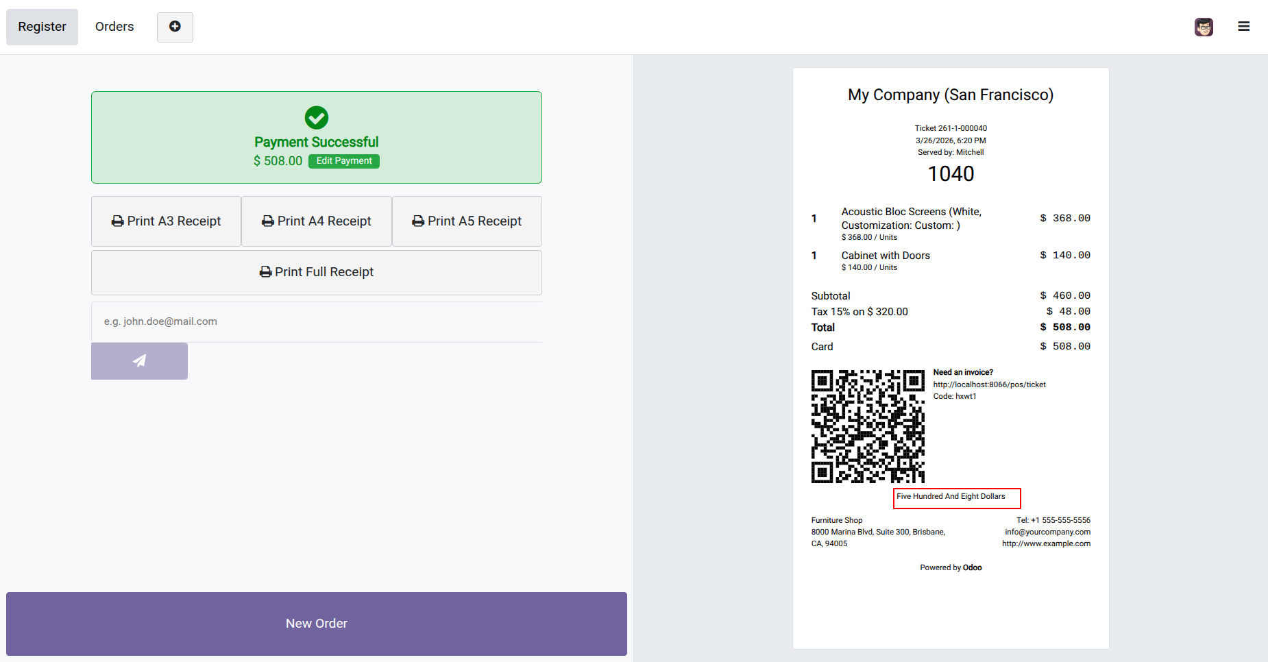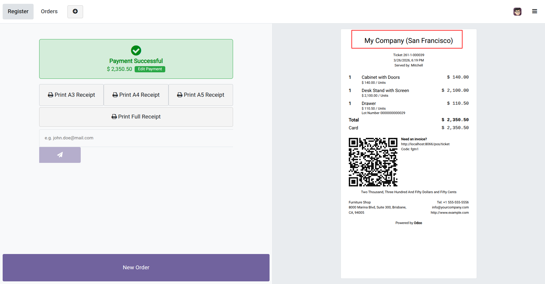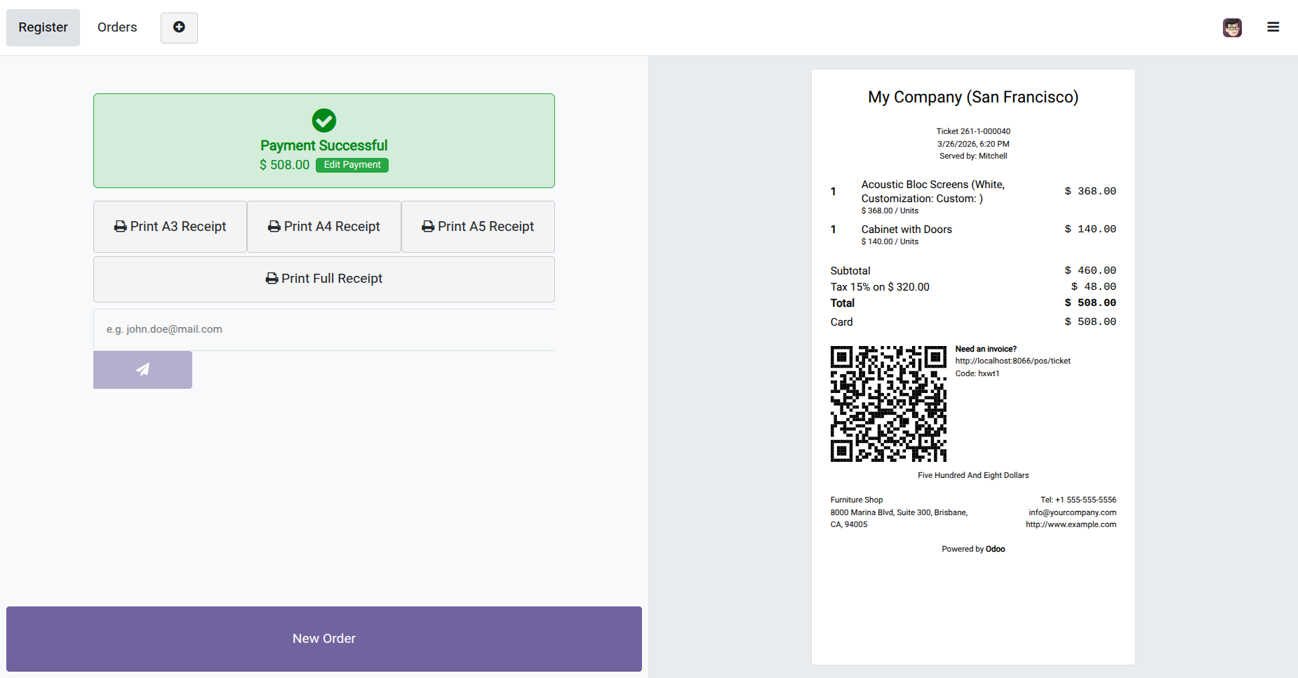 This POS module allows you to customize the receipt as per your choice. You can display Barcode or QRCode, invoice number & customer details(name, address, mobile number, phone number & email) in the POS order receipt.