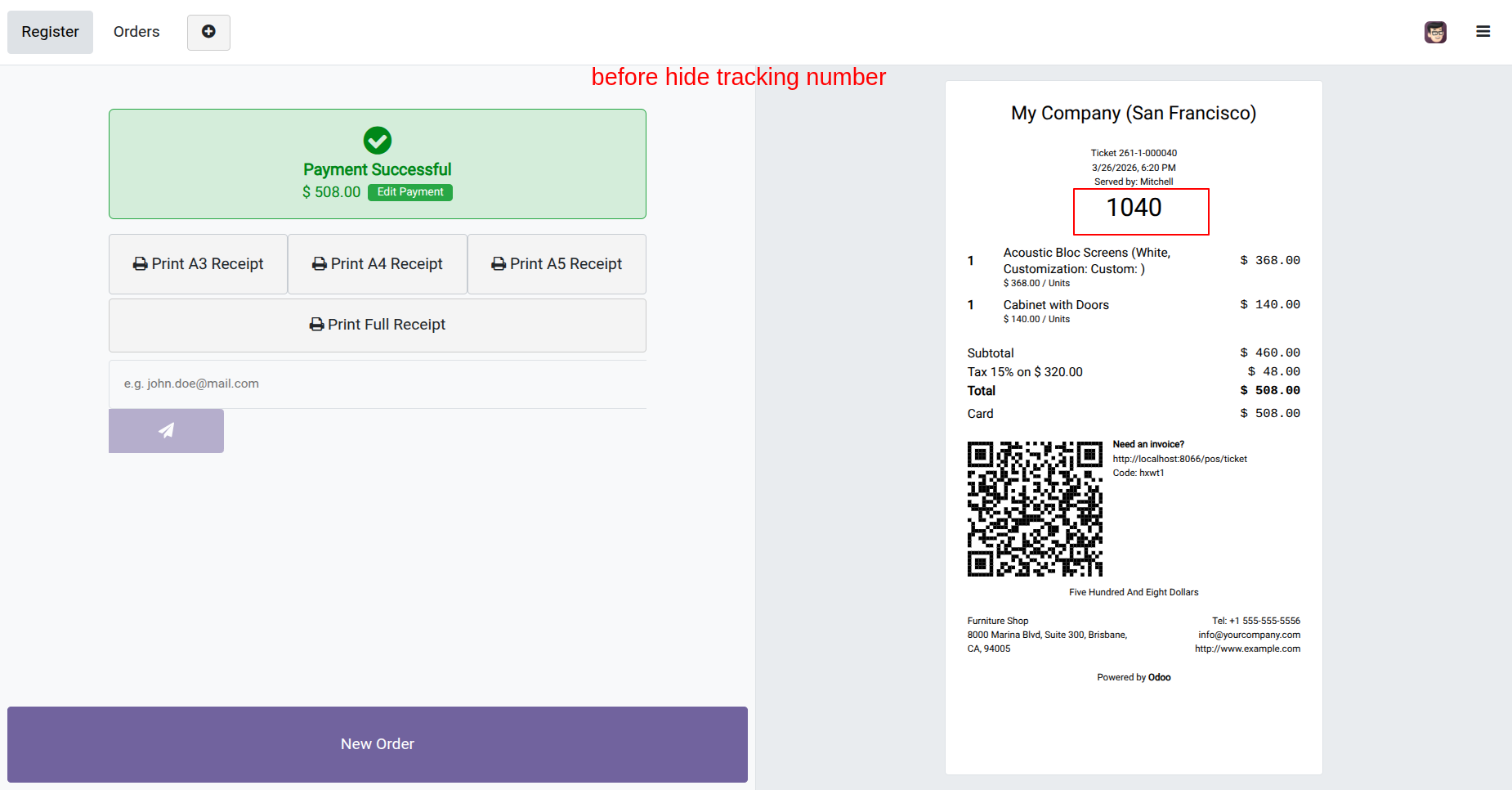 The tracking number is hidden on the receipt after enabling the 'Hide Tracking Number' option.
