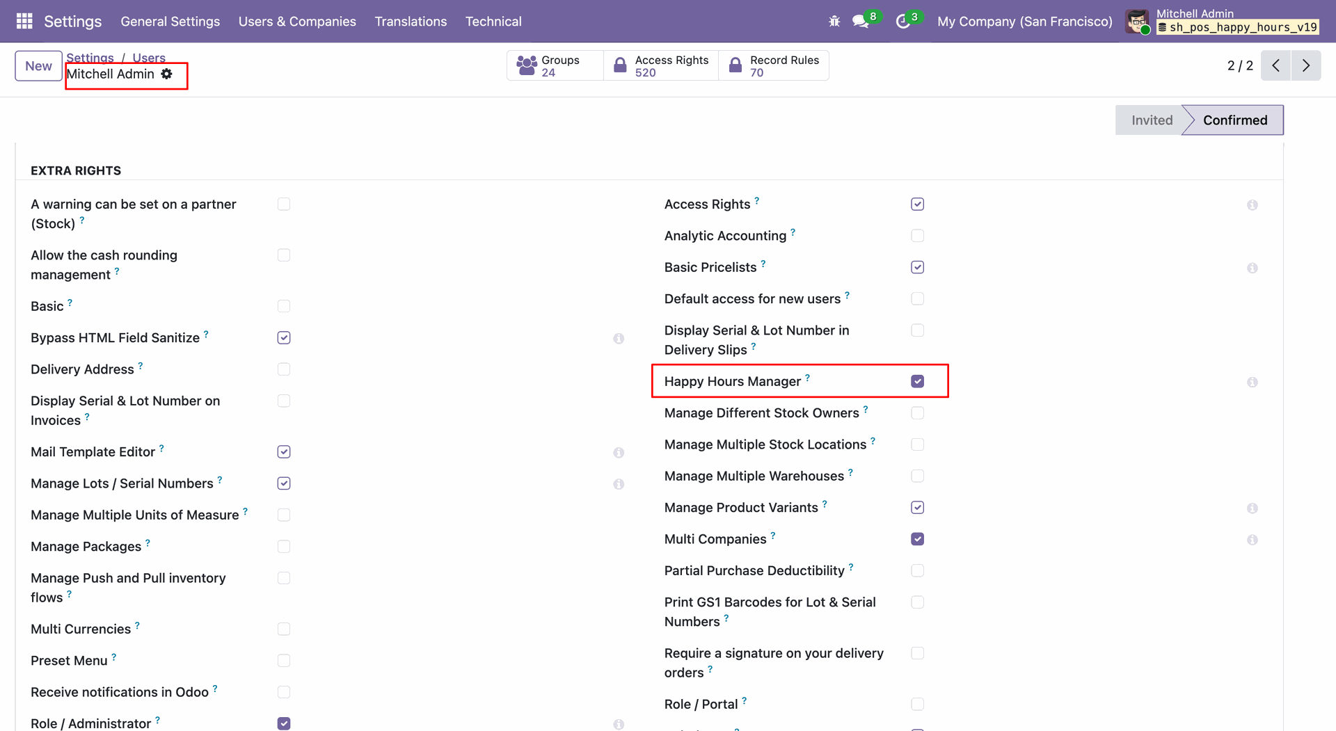 Enable the Happy Hours Manager checkbox in the Extra Rights section to grant the user full administrative access to Happy Hour configurations.