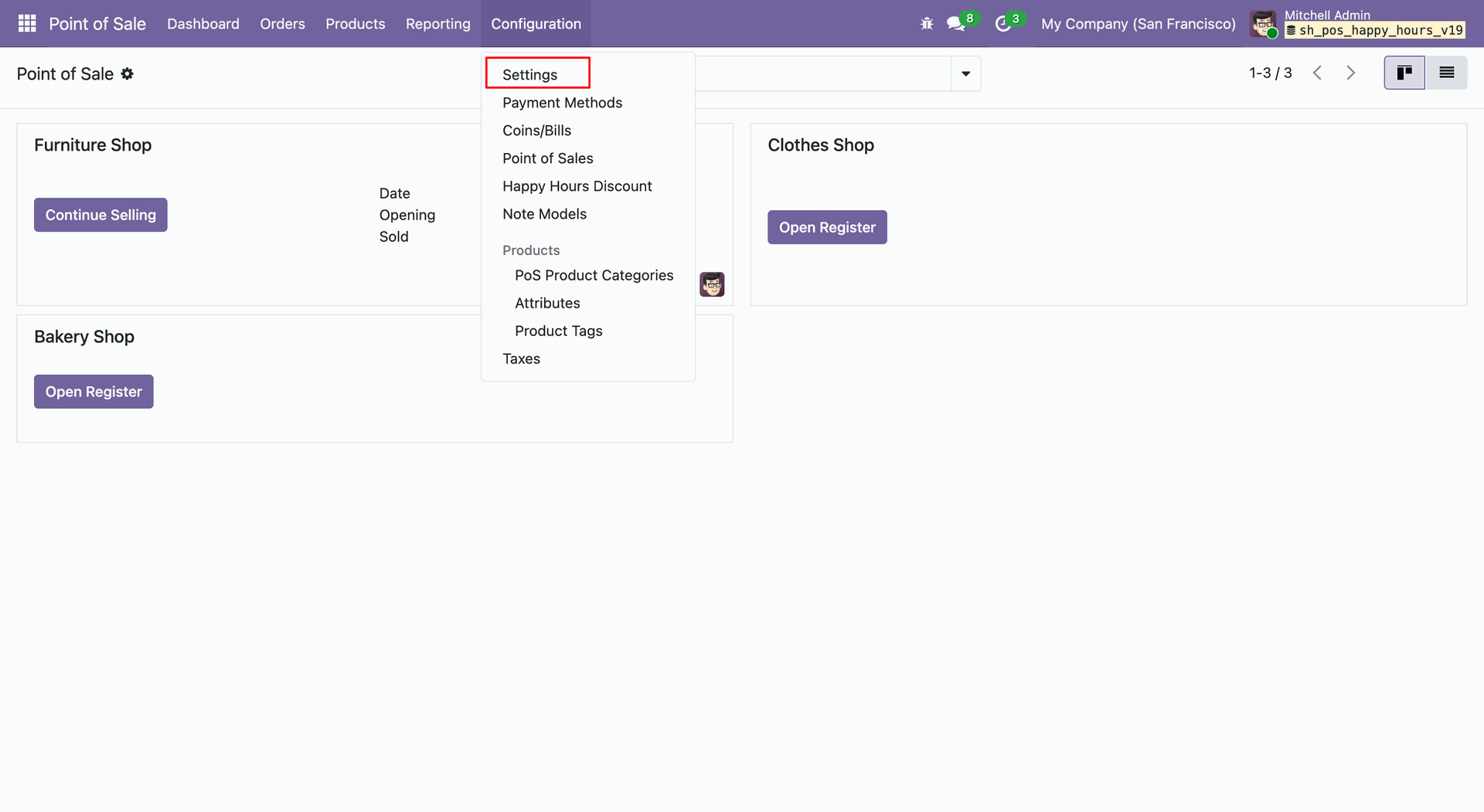 Navigate to Configuration -> Happy Hours Discount within the Point of Sale module to access the setup menu.
