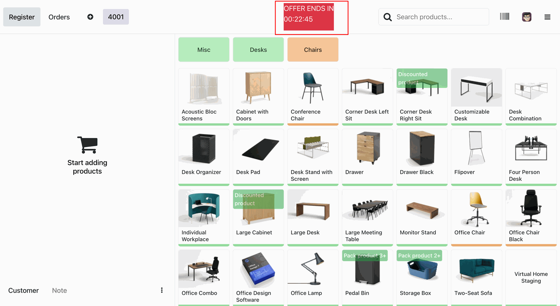 The POS interface displays a live countdown timer for the active offer and highlights eligible products with visual ribbons for easy identification.