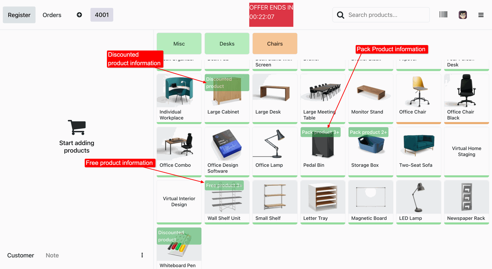 Highlight discounted and free products with clear visual labels in POS.