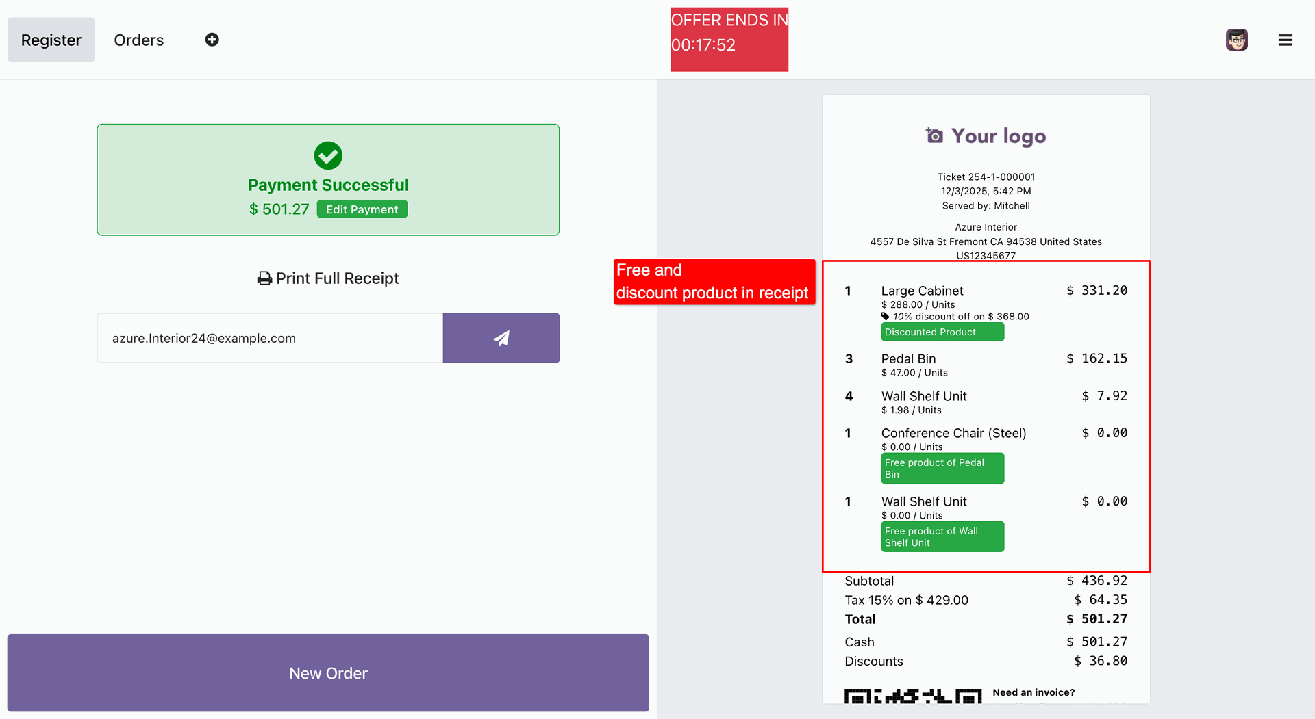 Receipt is generated with the free and discounted products.