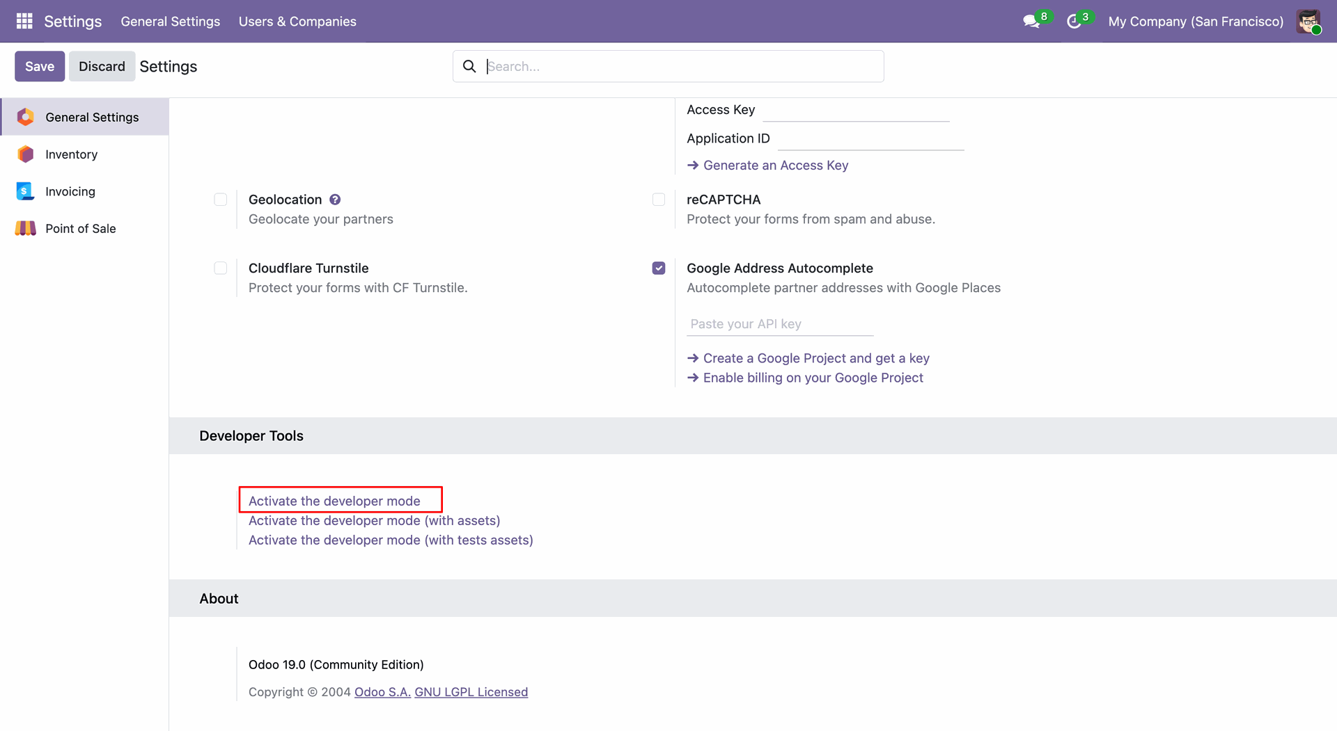 Navigate to Configuration -> Settings to access the general configuration options for the Point of Sale module.