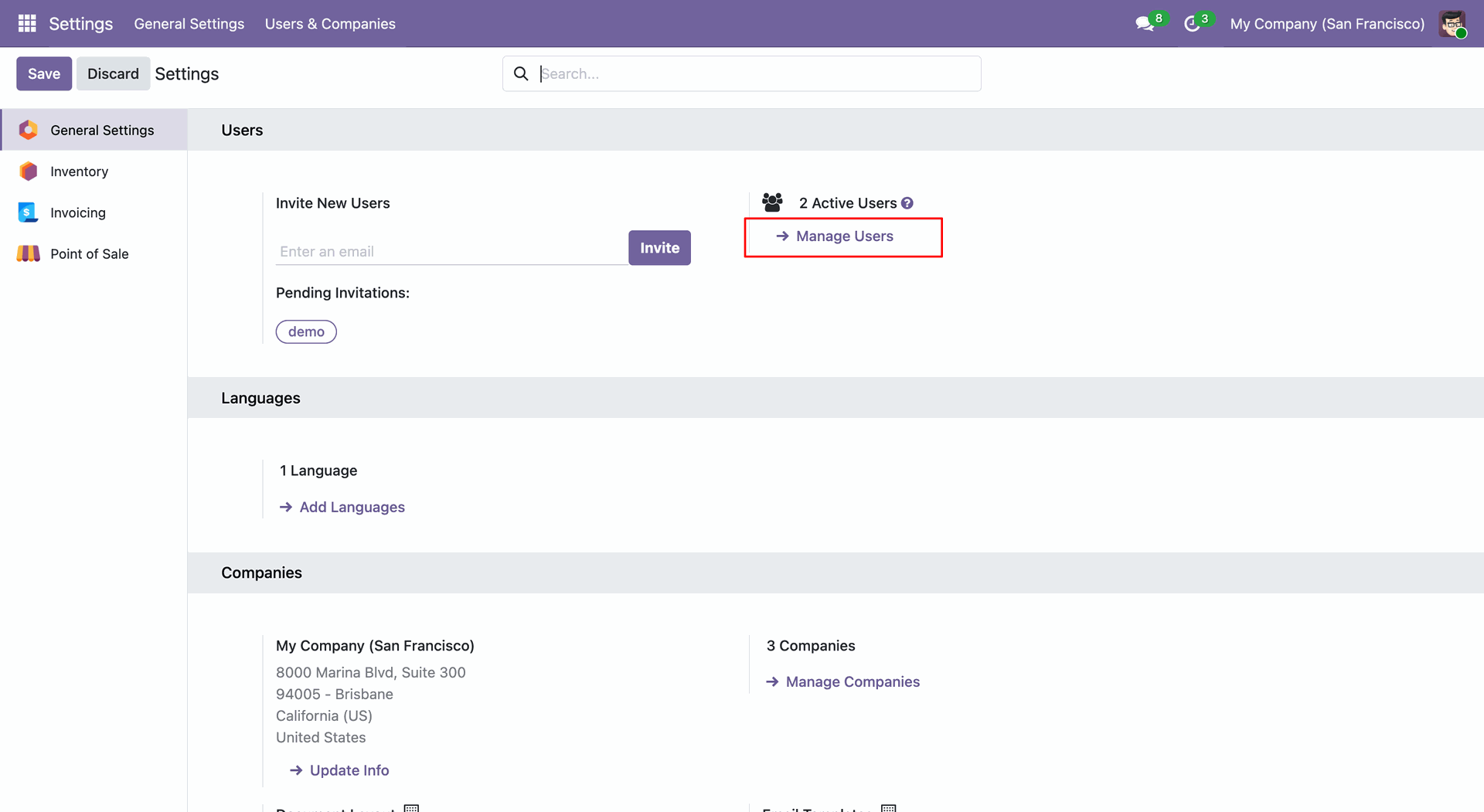 In the Users section, click the Manage Users link to open the full list of system users for editing and creation.
