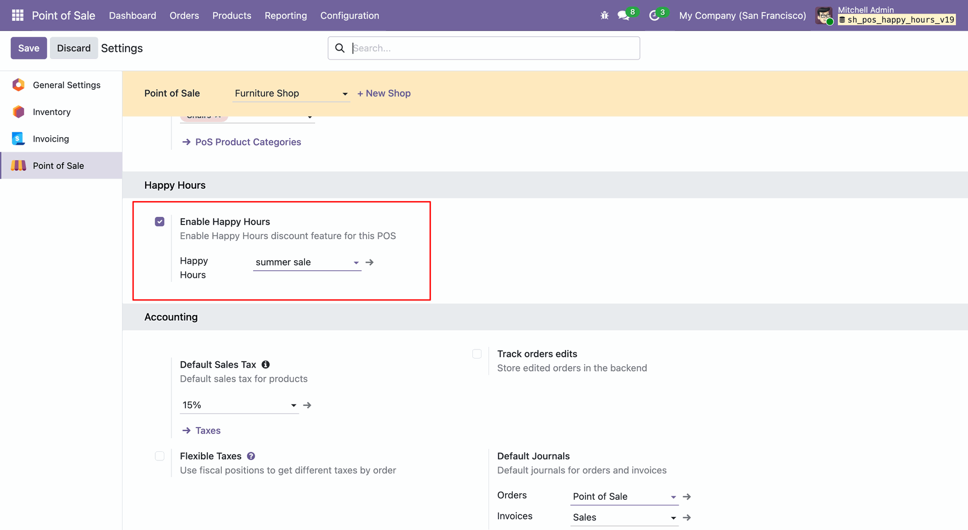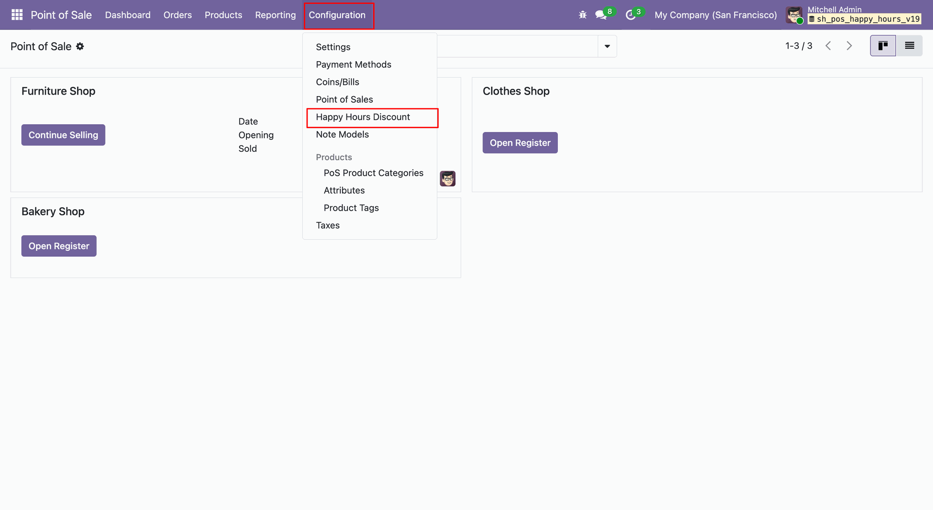 Navigate to Configuration -> Happy Hours Discount within the Point of Sale module to access the setup menu.