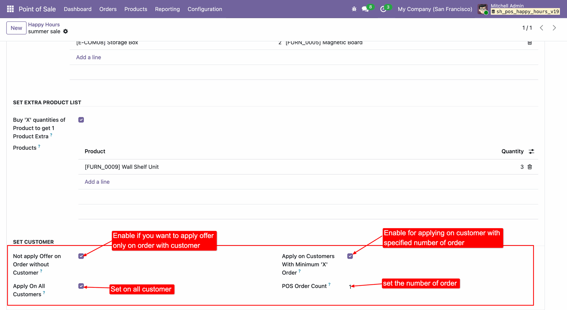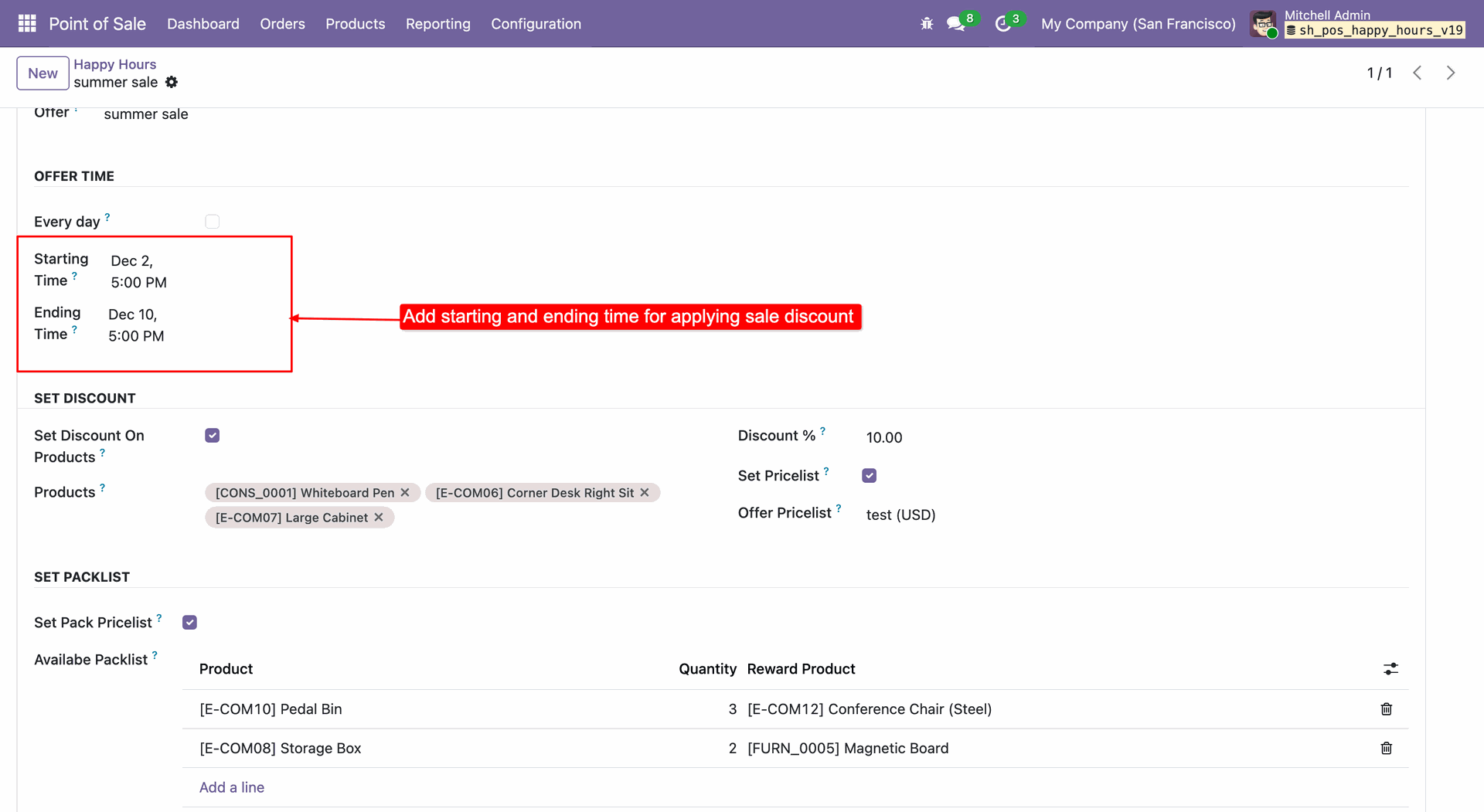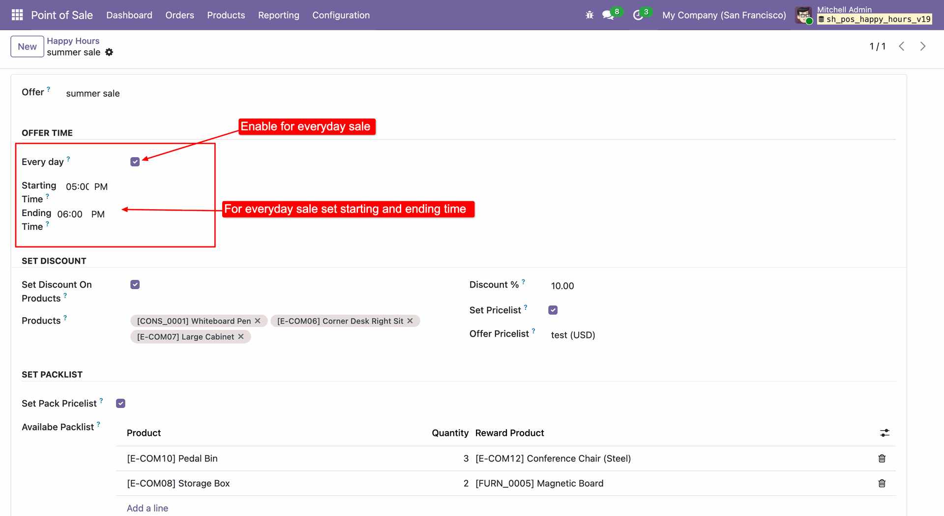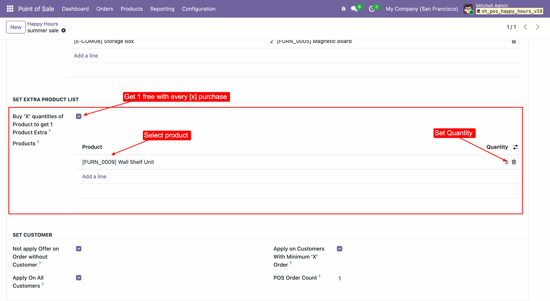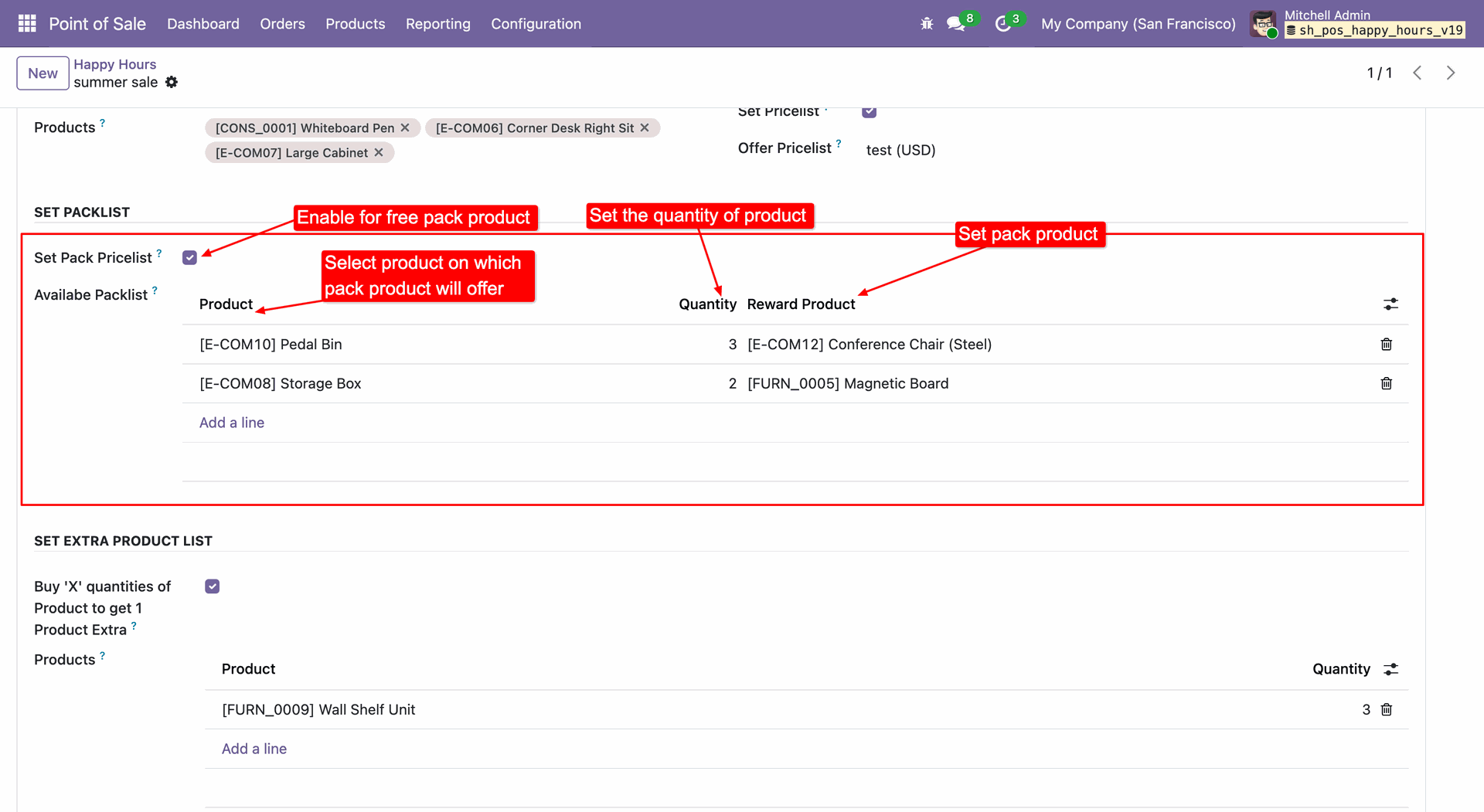 Enable Set Pack Pricelist to define reward rules, where purchasing a specific quantity of a product automatically triggers a free reward item.