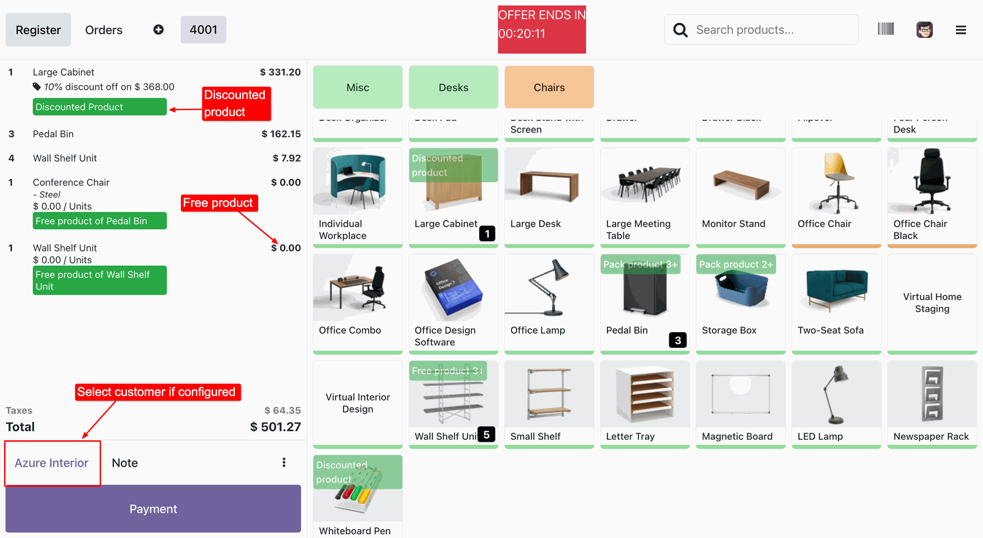 Highlight discounted and free products with clear visual labels in POS.