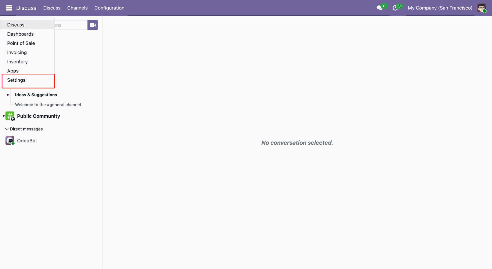 Navigate to Configuration -> Settings to access the general configuration options for the Point of Sale module.