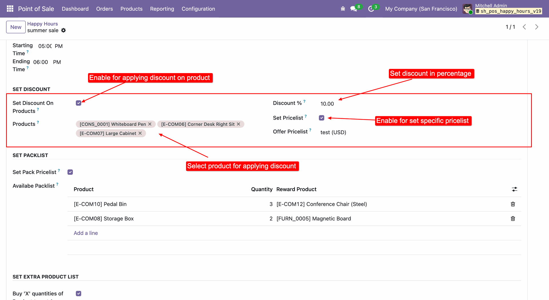 Enable Set Pack Pricelist to define reward rules, where purchasing a specific quantity of a product automatically triggers a free reward item.