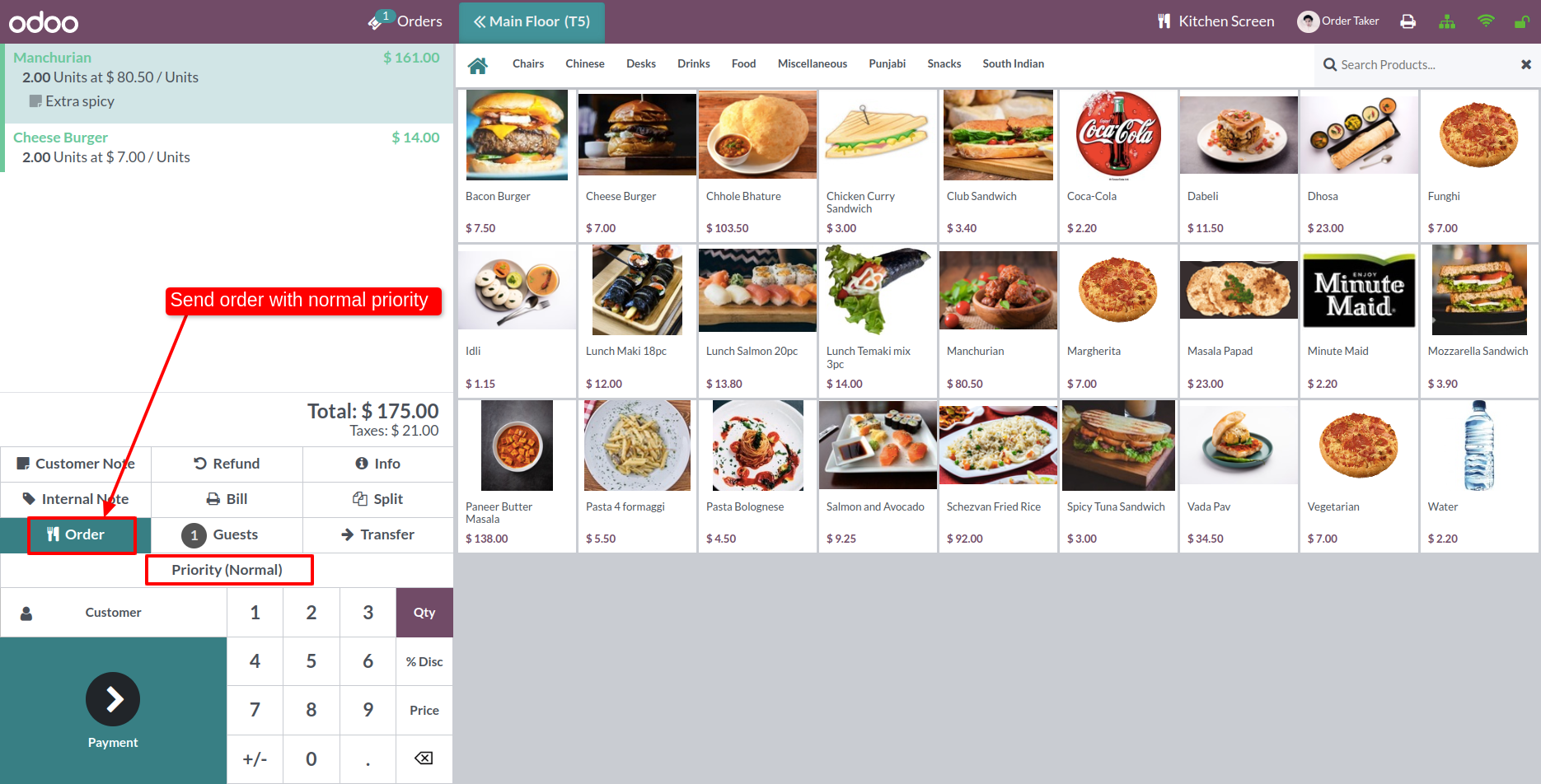 Set the order priority: High and then click the 'Order' button to send it to the kitchen screen.