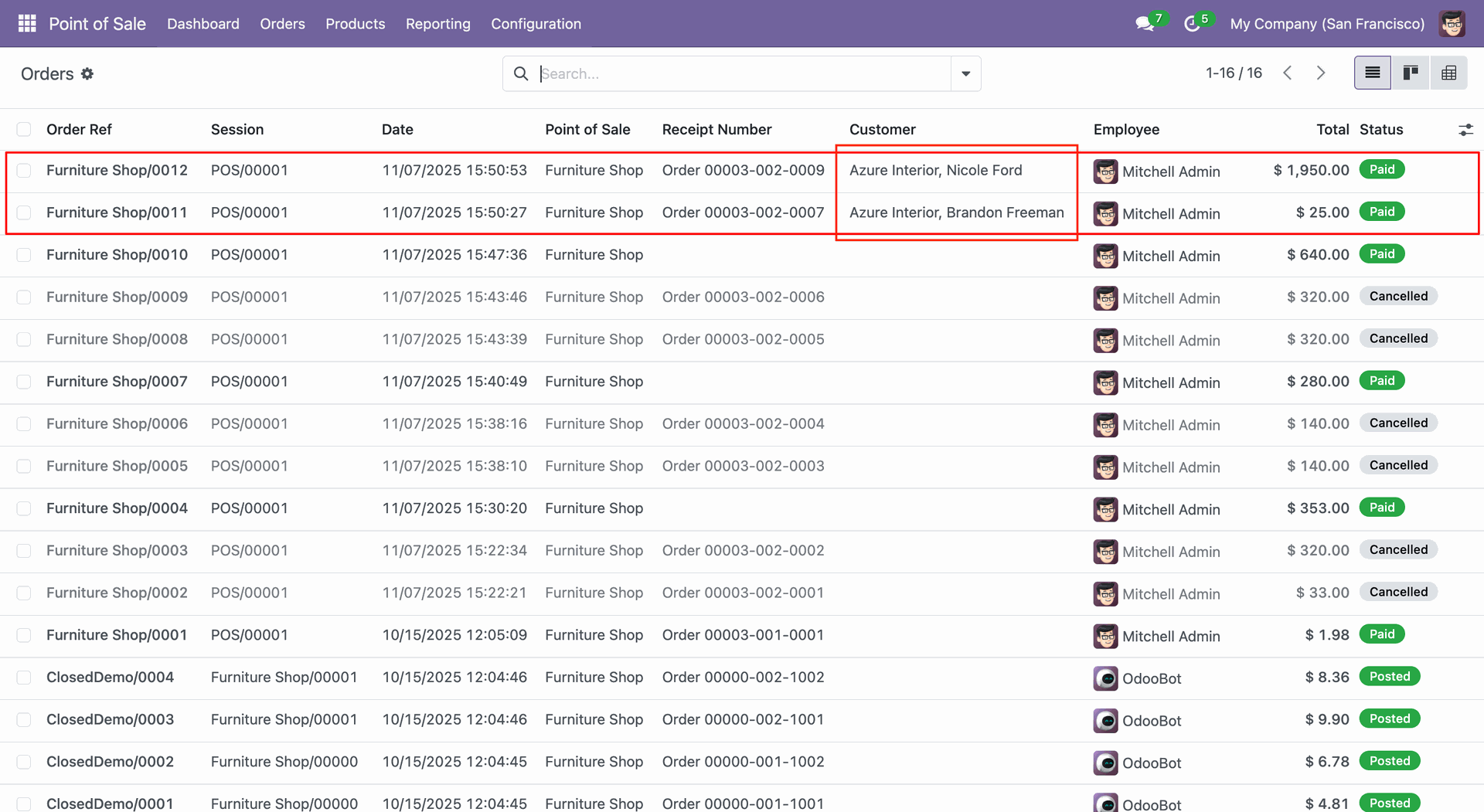 Here, you can see that the selected orders are deleted and a new one (0016) has been created.