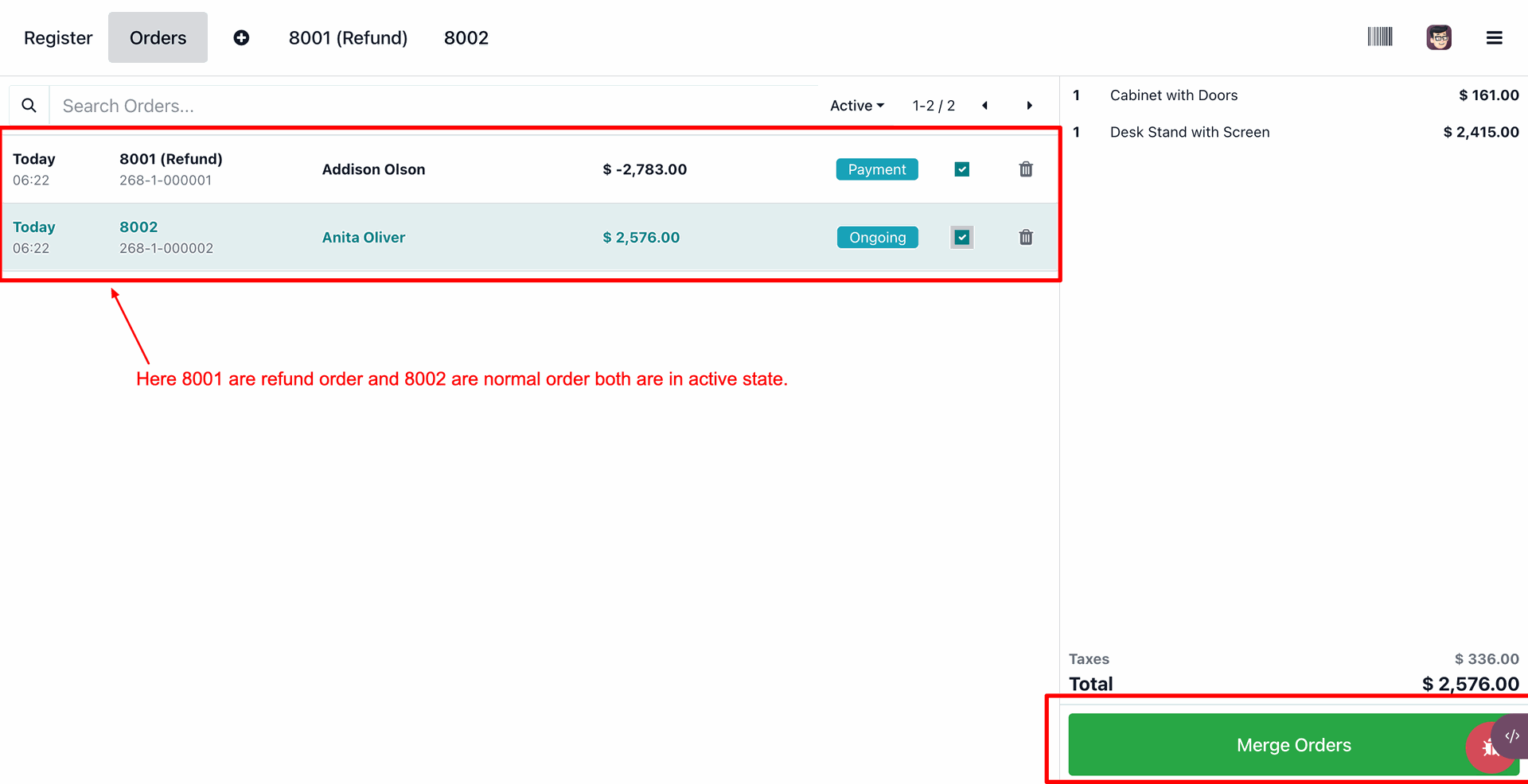 The user selects the active orders 4001 and 4002 using the highlighted checkboxes and clicks the green Merge Orders button to combine them into a single transaction.