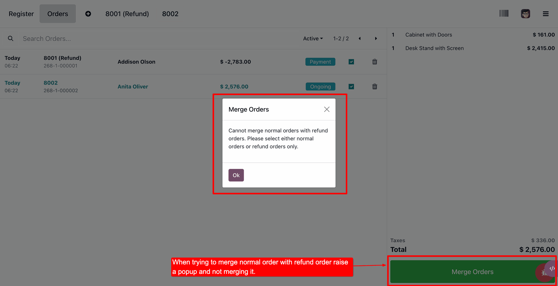 The user receives a Merge Orders warning pop-up which prevents merging normal orders with refund orders.