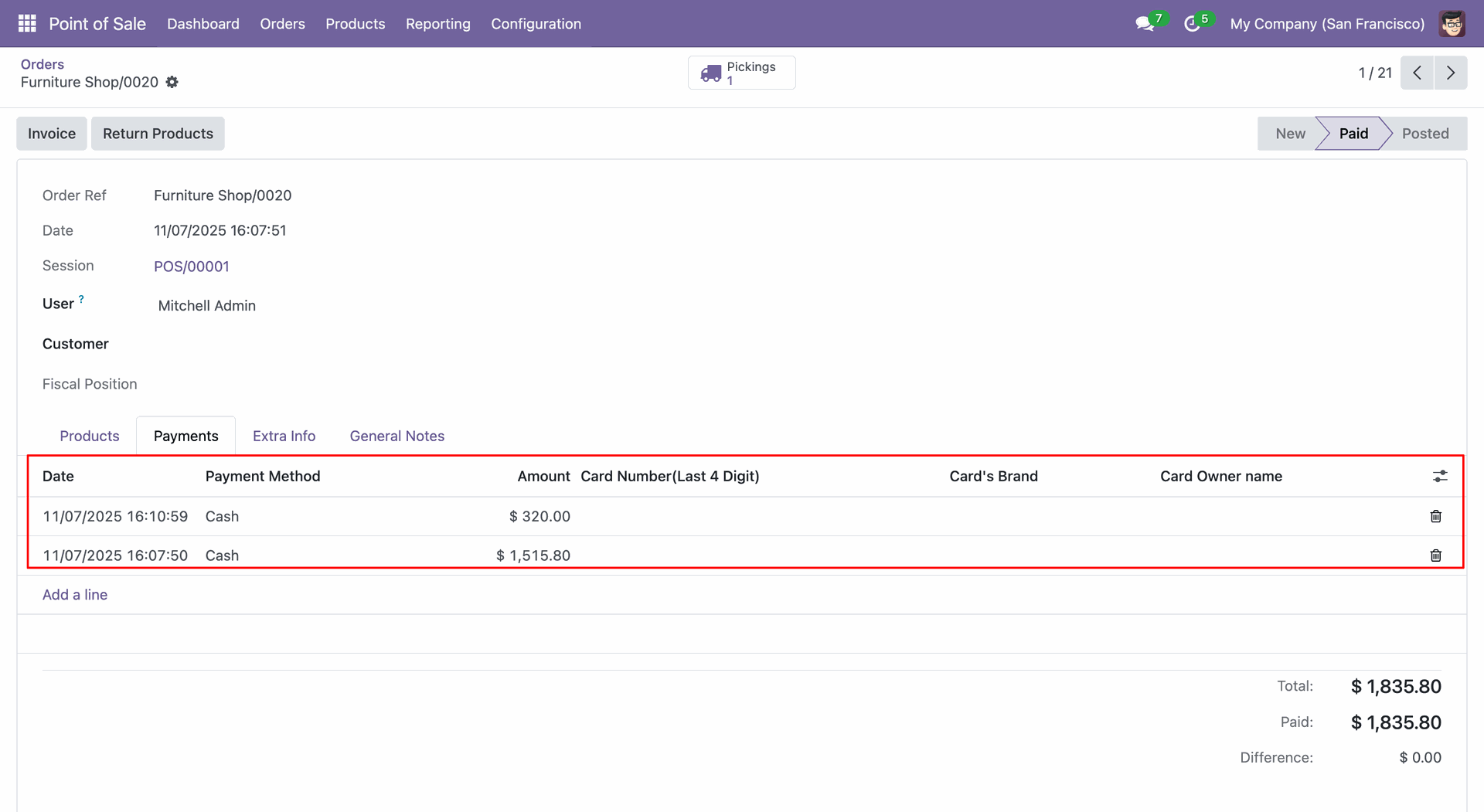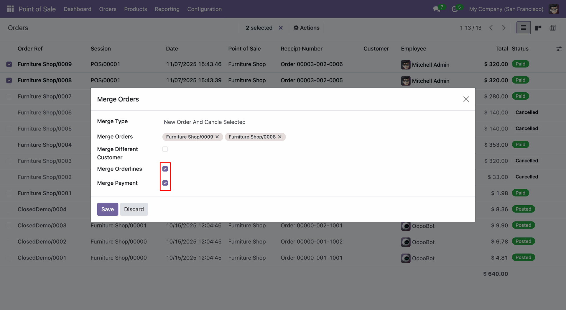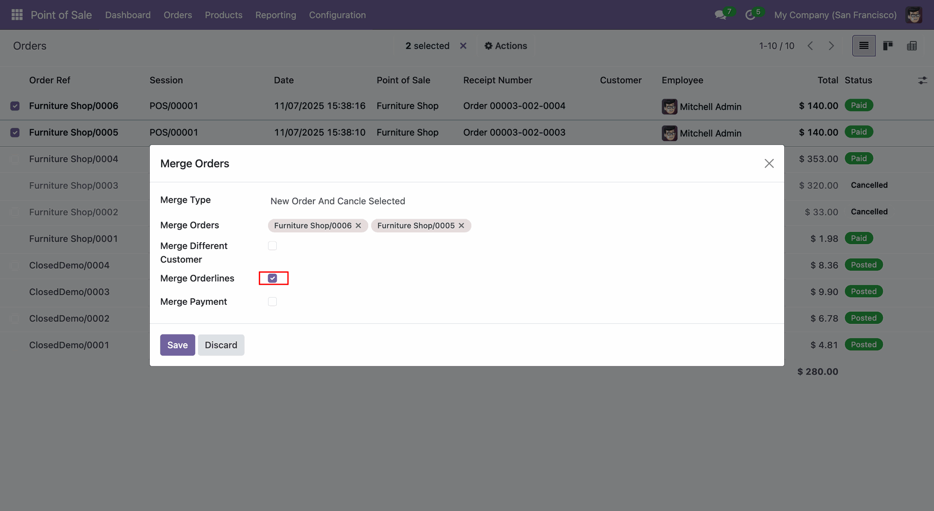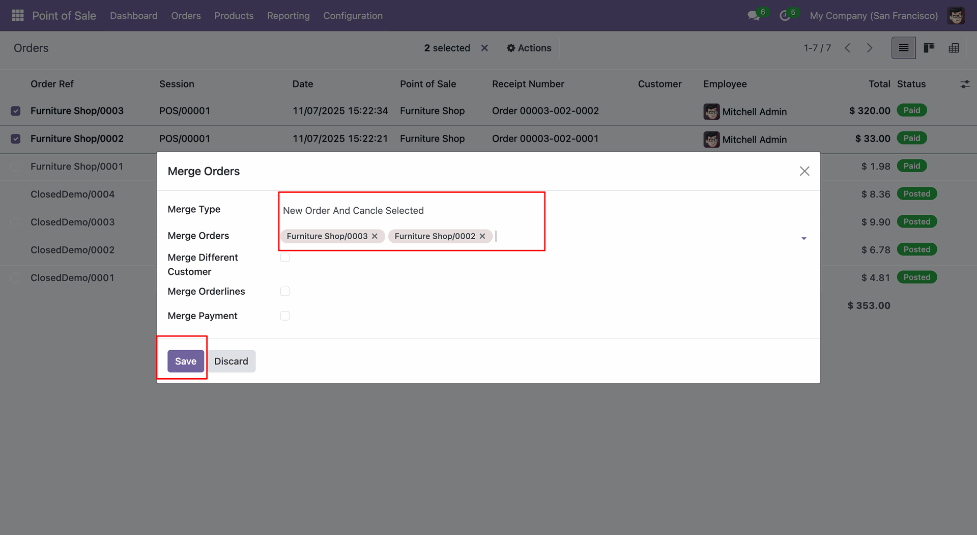 Tick the "Merge Orderlines" and "Merge Payment" checkboxes and click on the "Save" button.