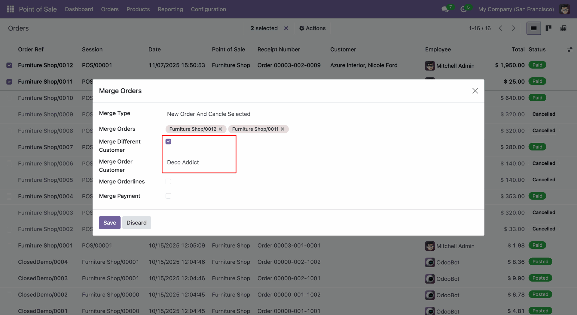Merge POS orders from the same or different customers with full control over the final customer assignment.
