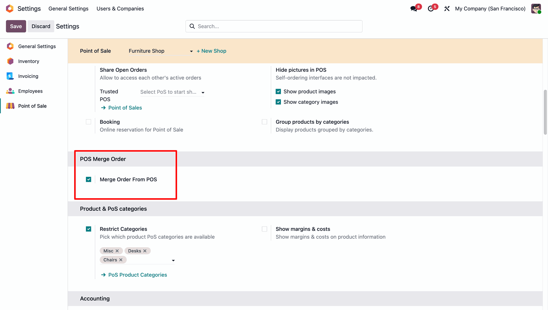 The user enables the Merge Order From POS setting, which is highlighted under the POS Merge Order section.
