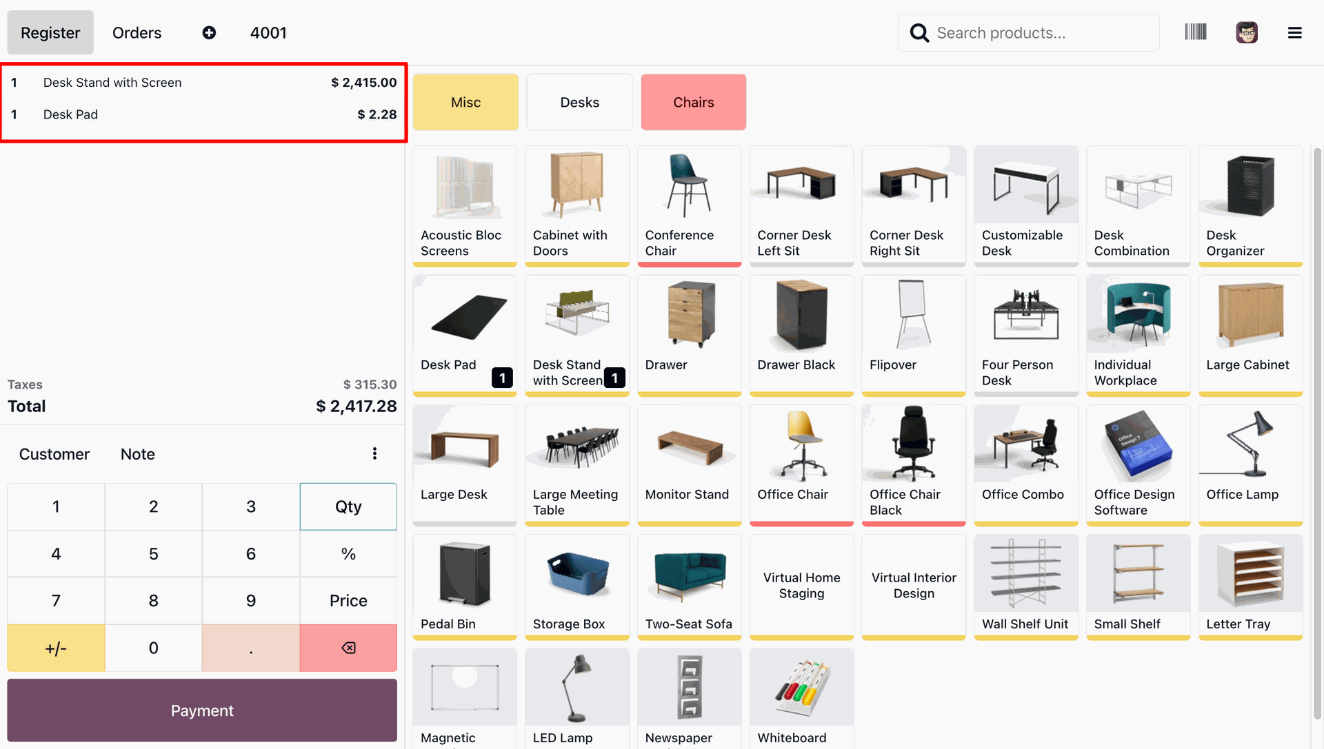 The user views the active order list for Order 4001, which highlights the added items: a Desk Stand with Screen and a Desk Pad.