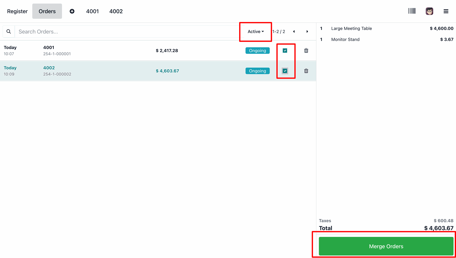The user selects the active orders 4001 and 4002 using the highlighted checkboxes and clicks the green Merge Orders button to combine them into a single transaction.
