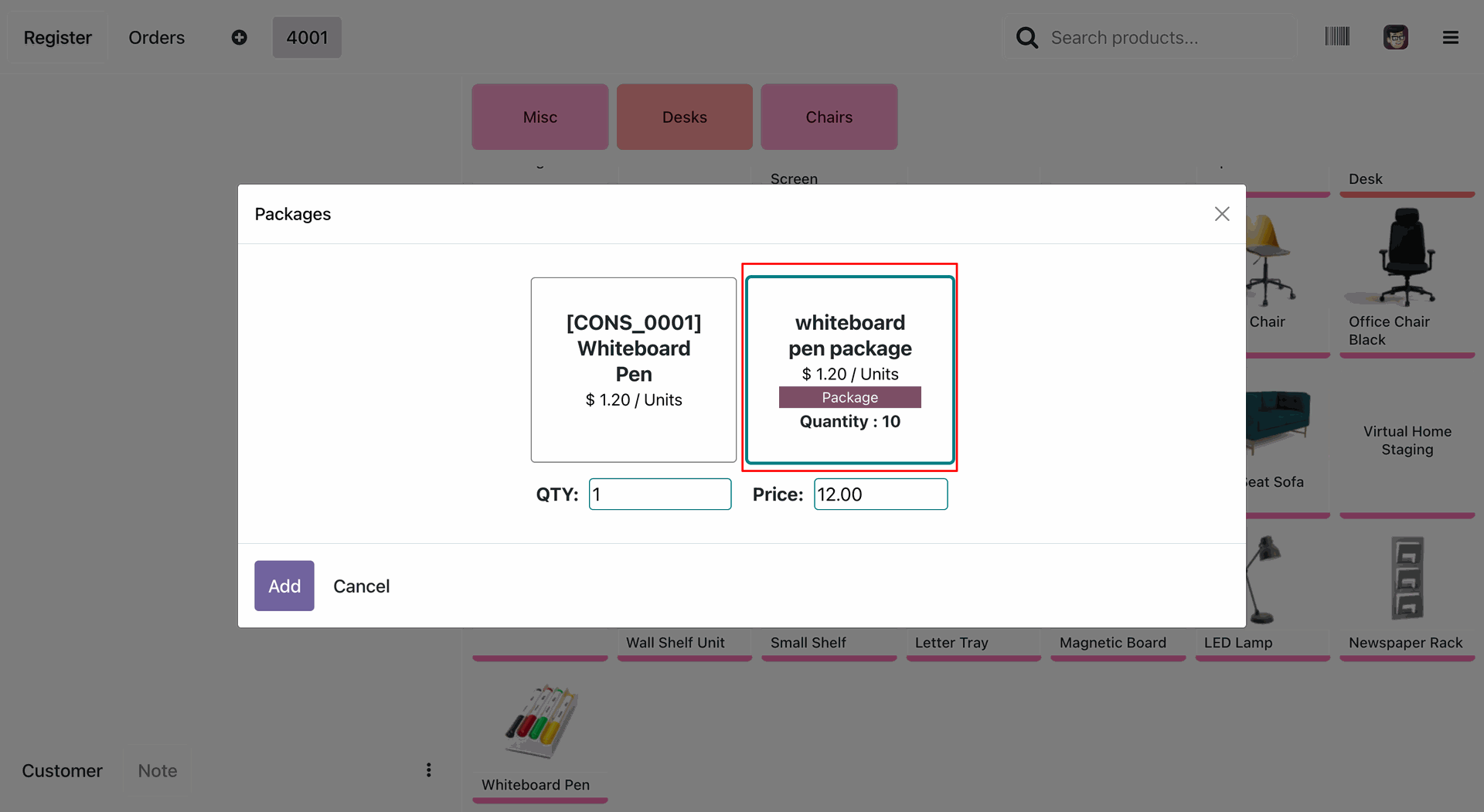The user selects the whiteboard pen package from the Packages, where the red box highlights the Quantity : 10 and the calculated total Price of 12.00.