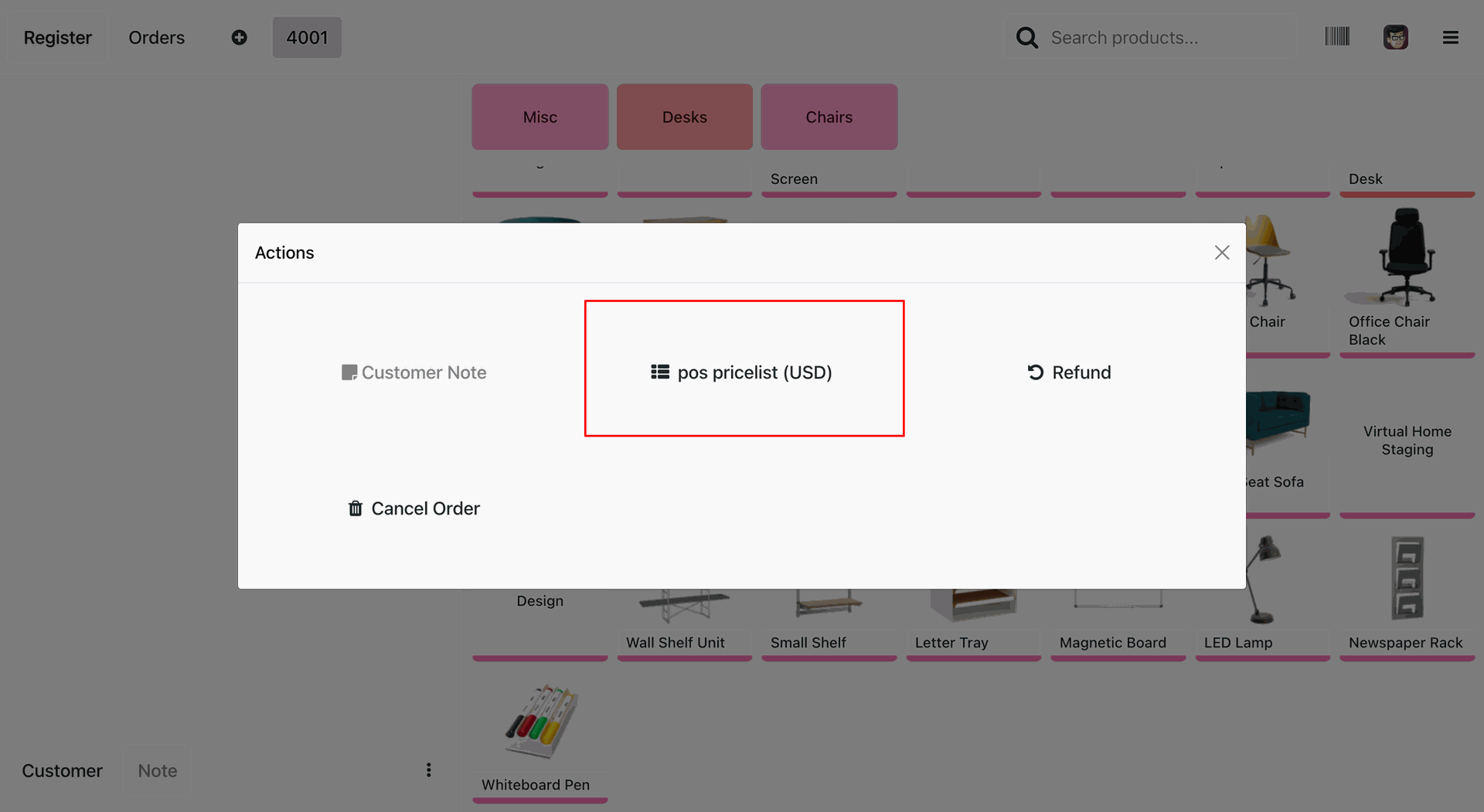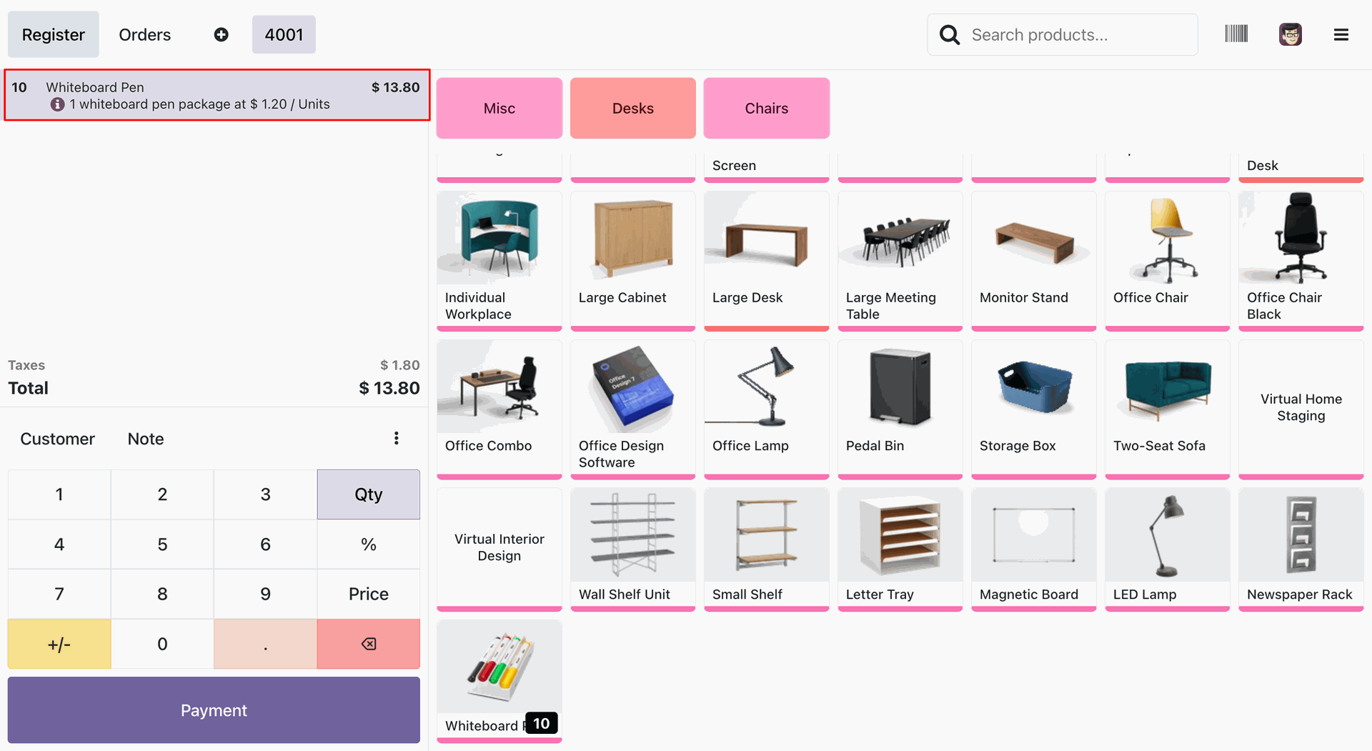 The user selects the Whiteboard Pen from the product grid in the POS interface for Order 4001, as highlighted by the red box.