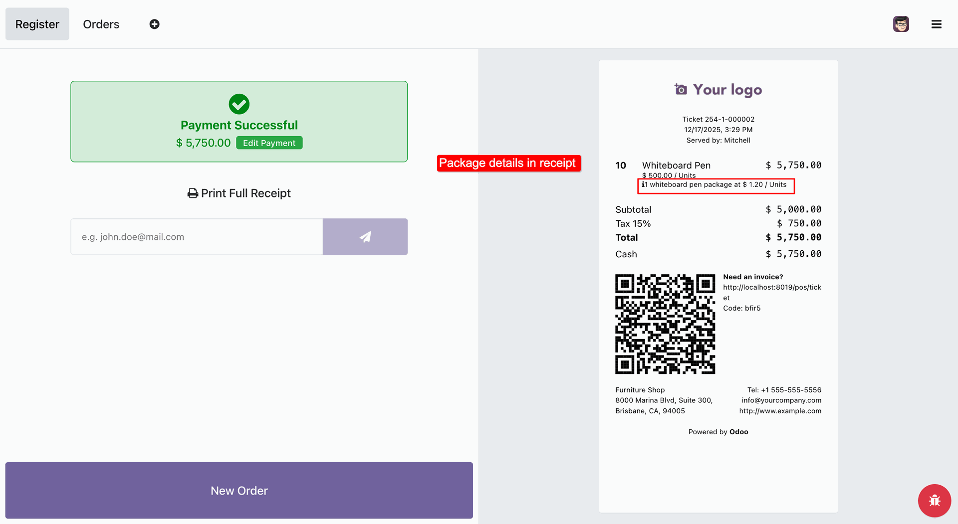 The user reviews the receipt on the Payment Successful screen, where a red box and annotation highlight the printed package details: '1 whiteboard pen package at $ 1.20 / Units'.
