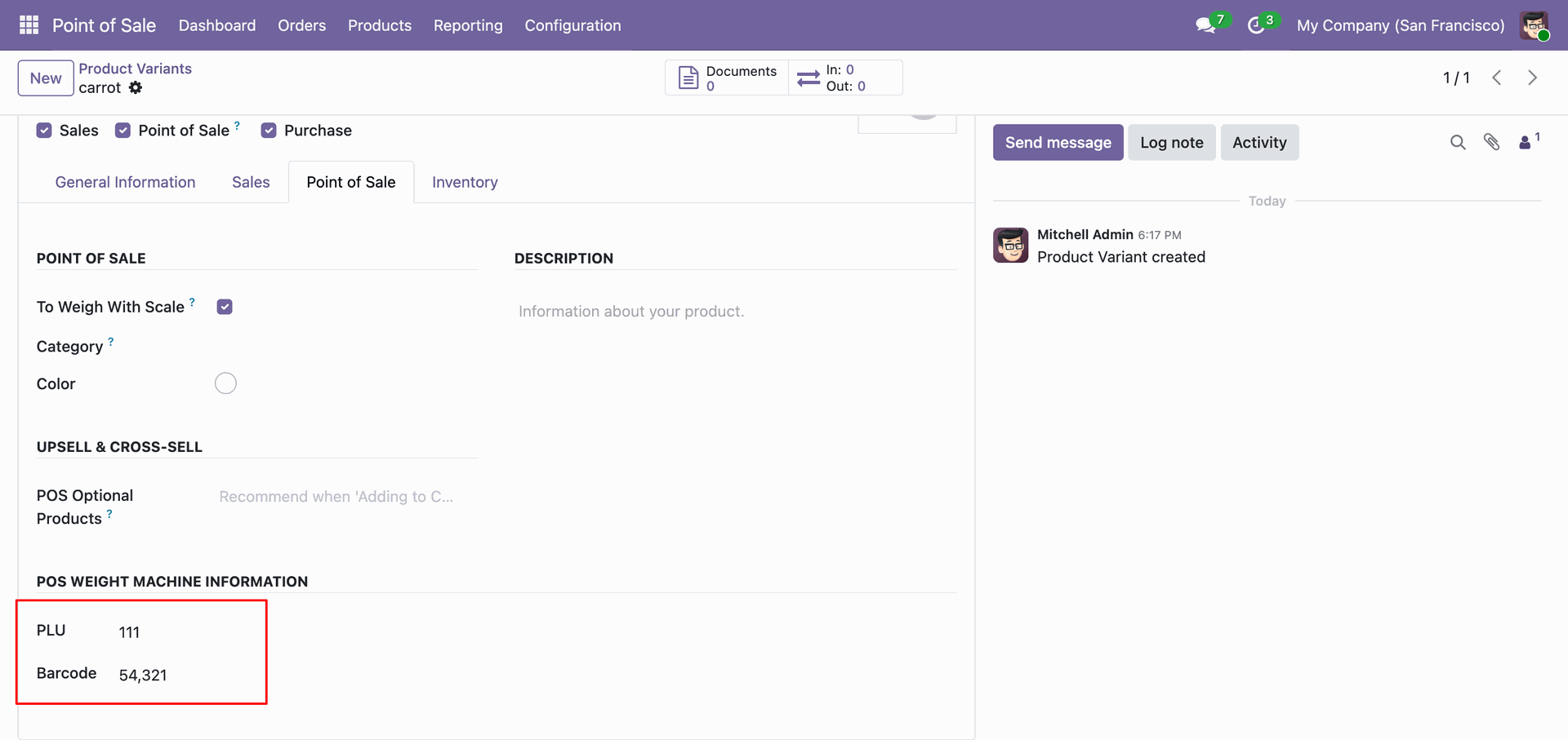 Enter the PLU and Barcode in the POS WEIGHT MACHINE INFORMATION section to map the Odoo product to the corresponding item in the weighing scale's memory.