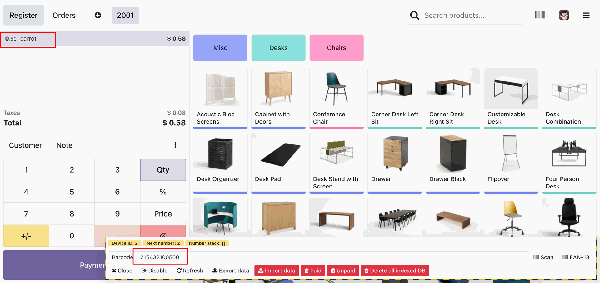Scanning the barcode 215432100500 automatically adds the 'carrot' to the cart with the parsed weight of 0.50, validating the barcode nomenclature configuration.