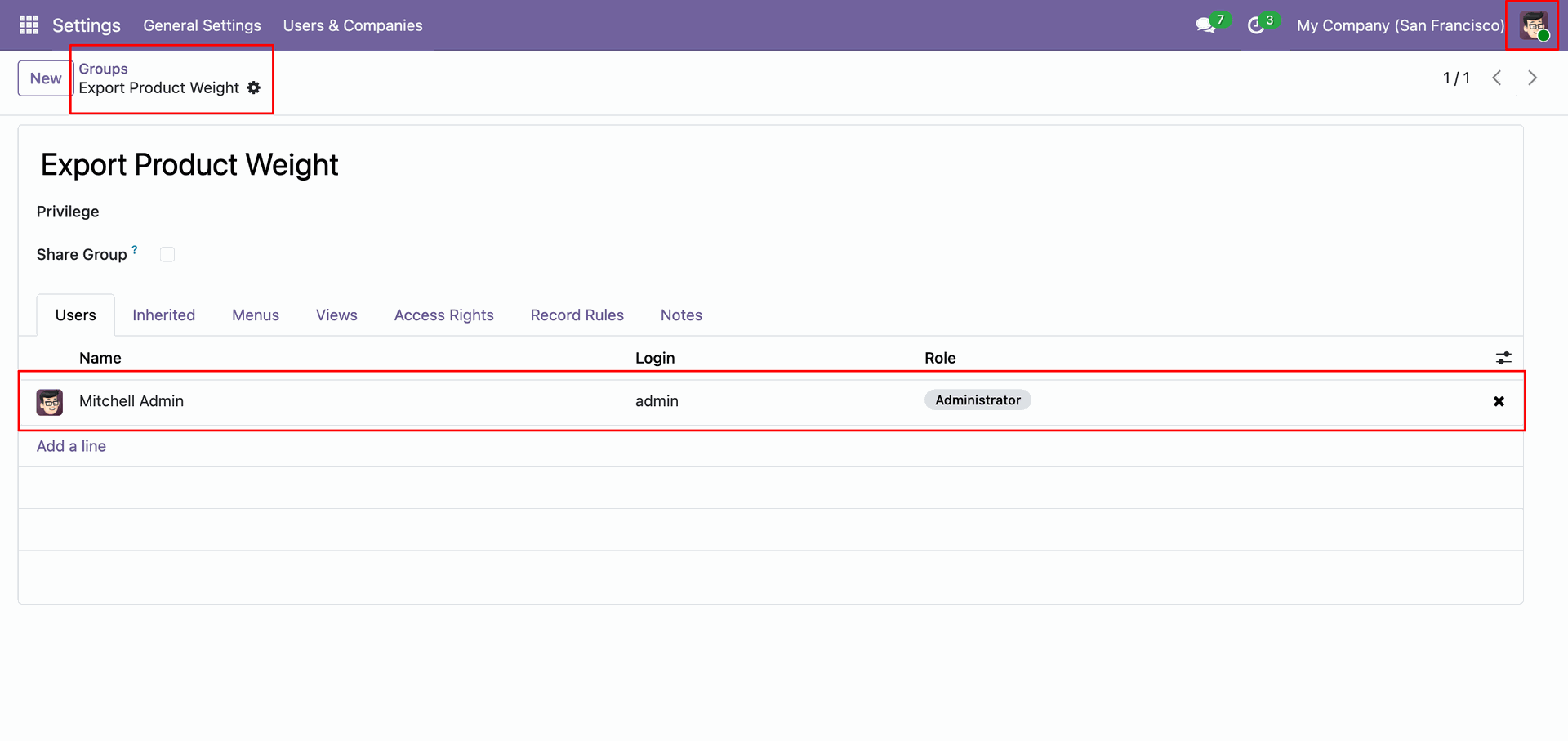 Add users like Mitchell Admin to the Export Product Weight group to explicitly grant them permission to export weight data to the scale.