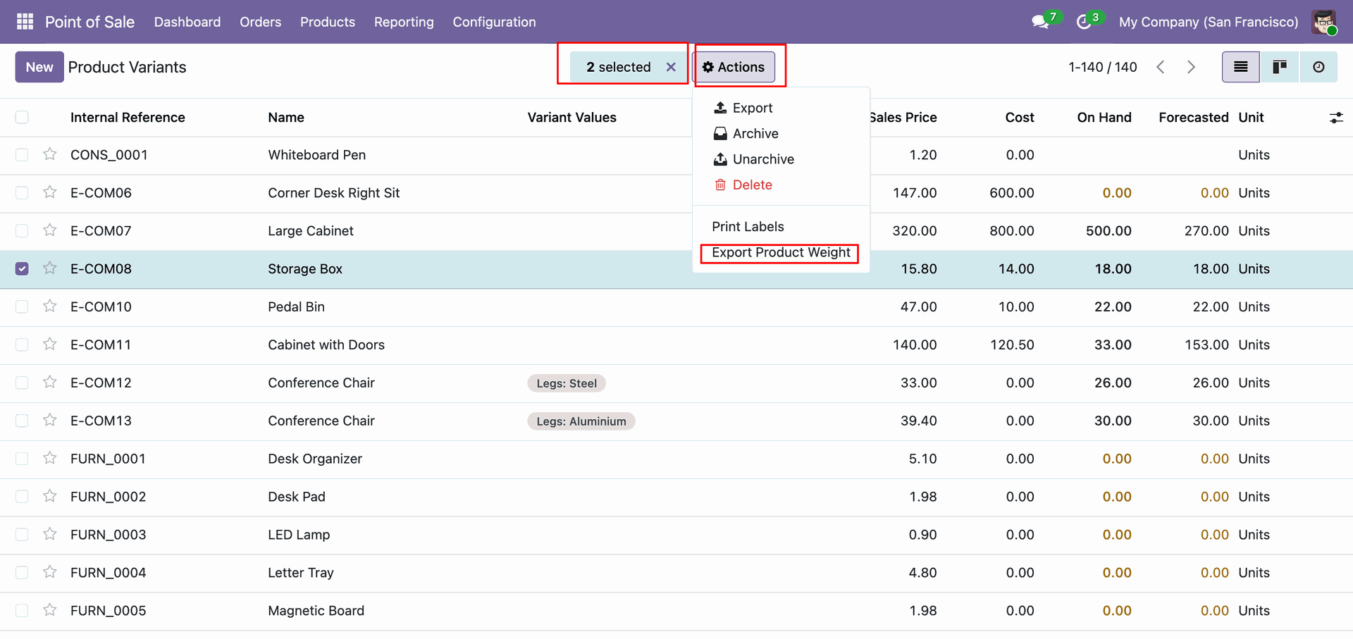Select multiple products in the list view, click Actions, and choose Export Product Weight to efficiently export data for specific items in bulk.