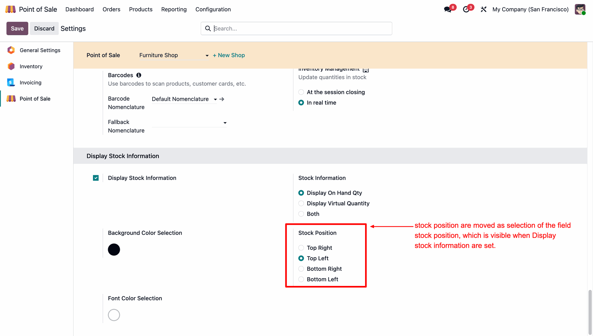 Go to the POS settings and enable the 'Display Stock Information' option.