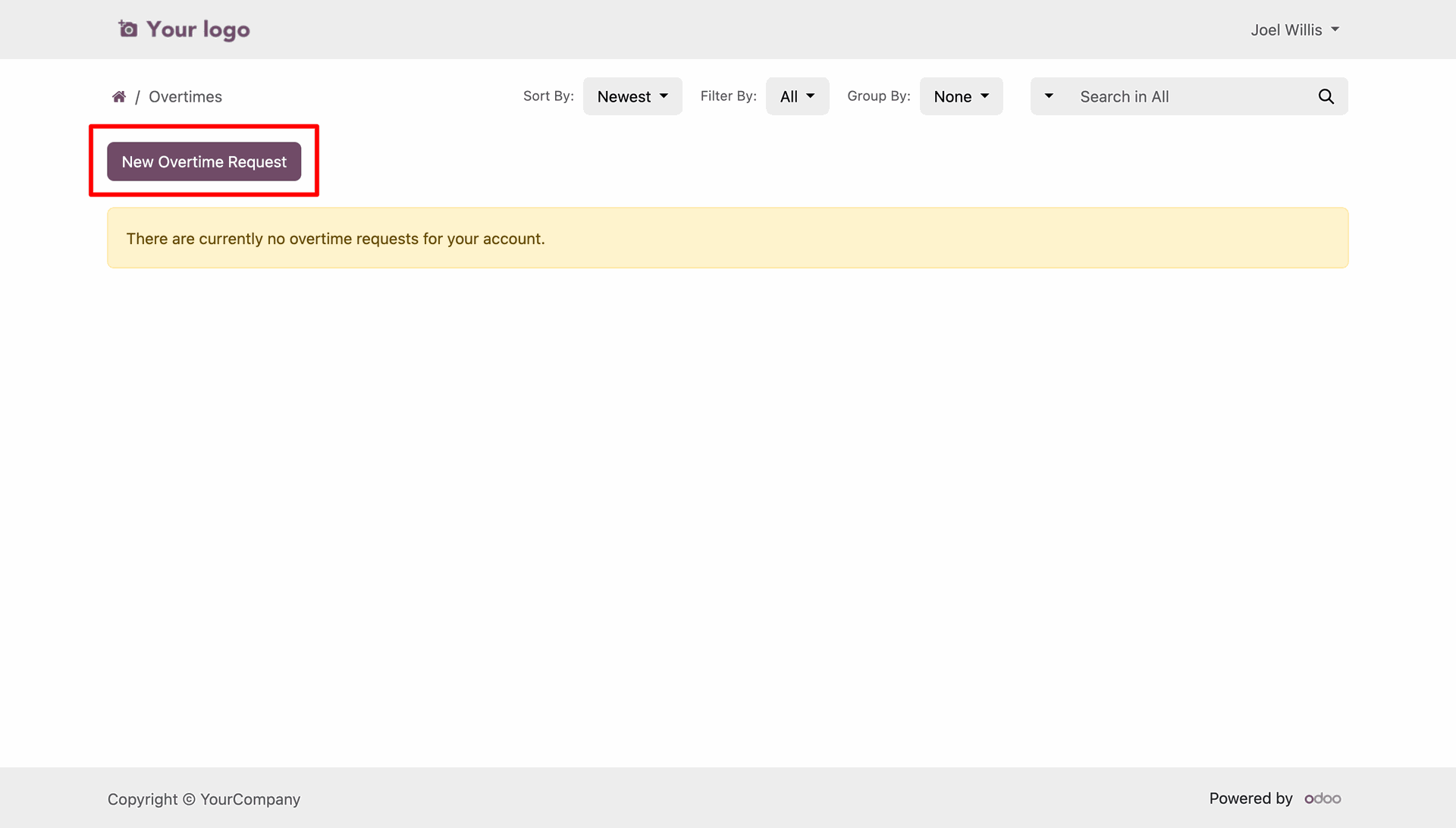 Once created, the overtime request appears in the list view in 'New' (Draft) state.