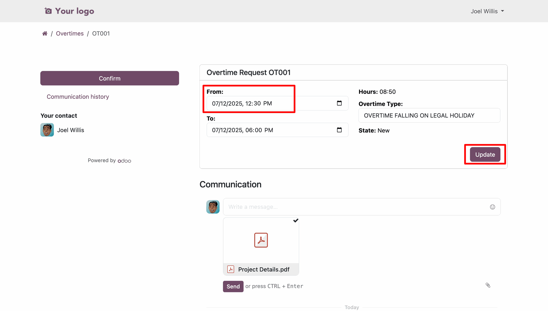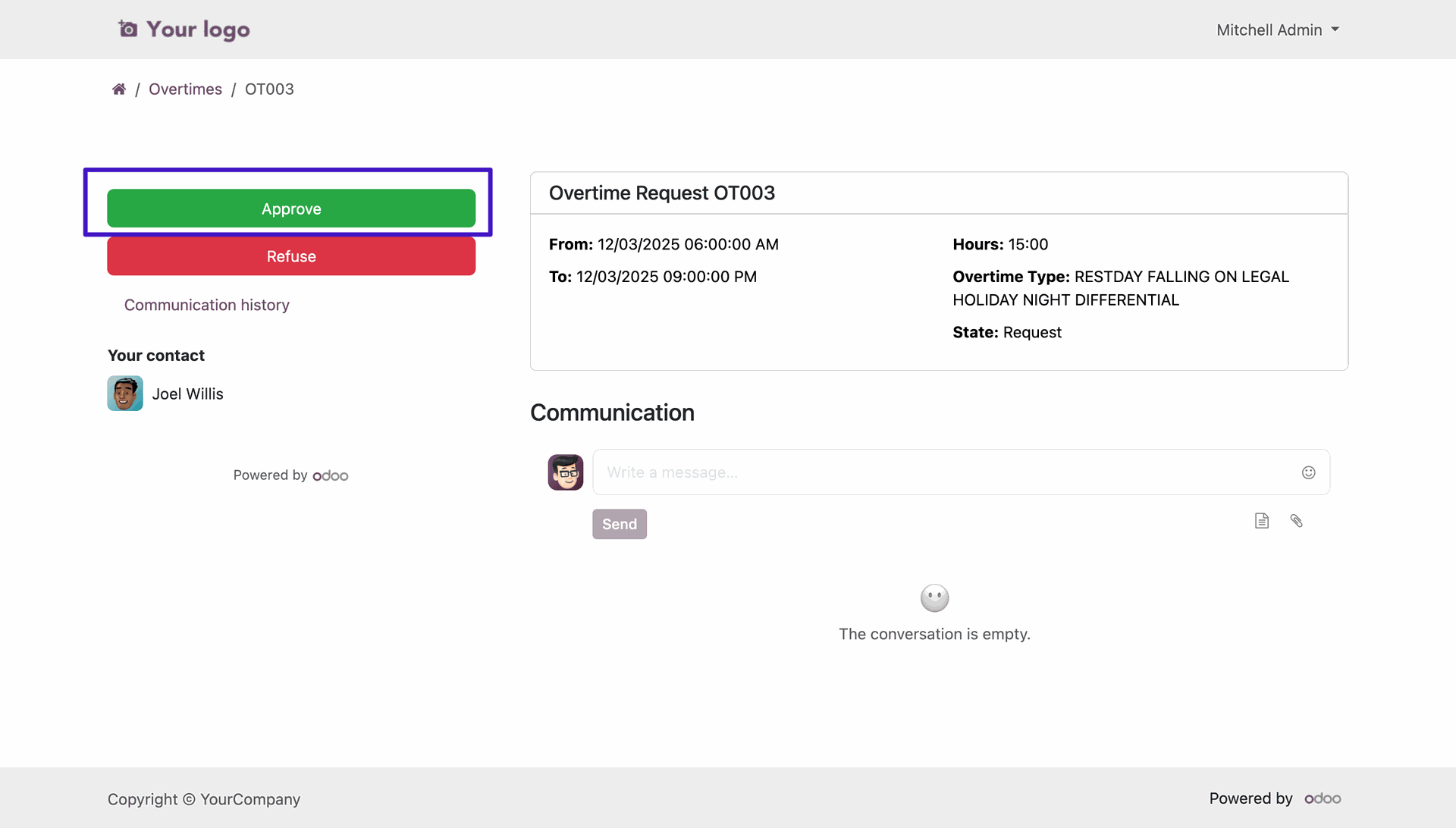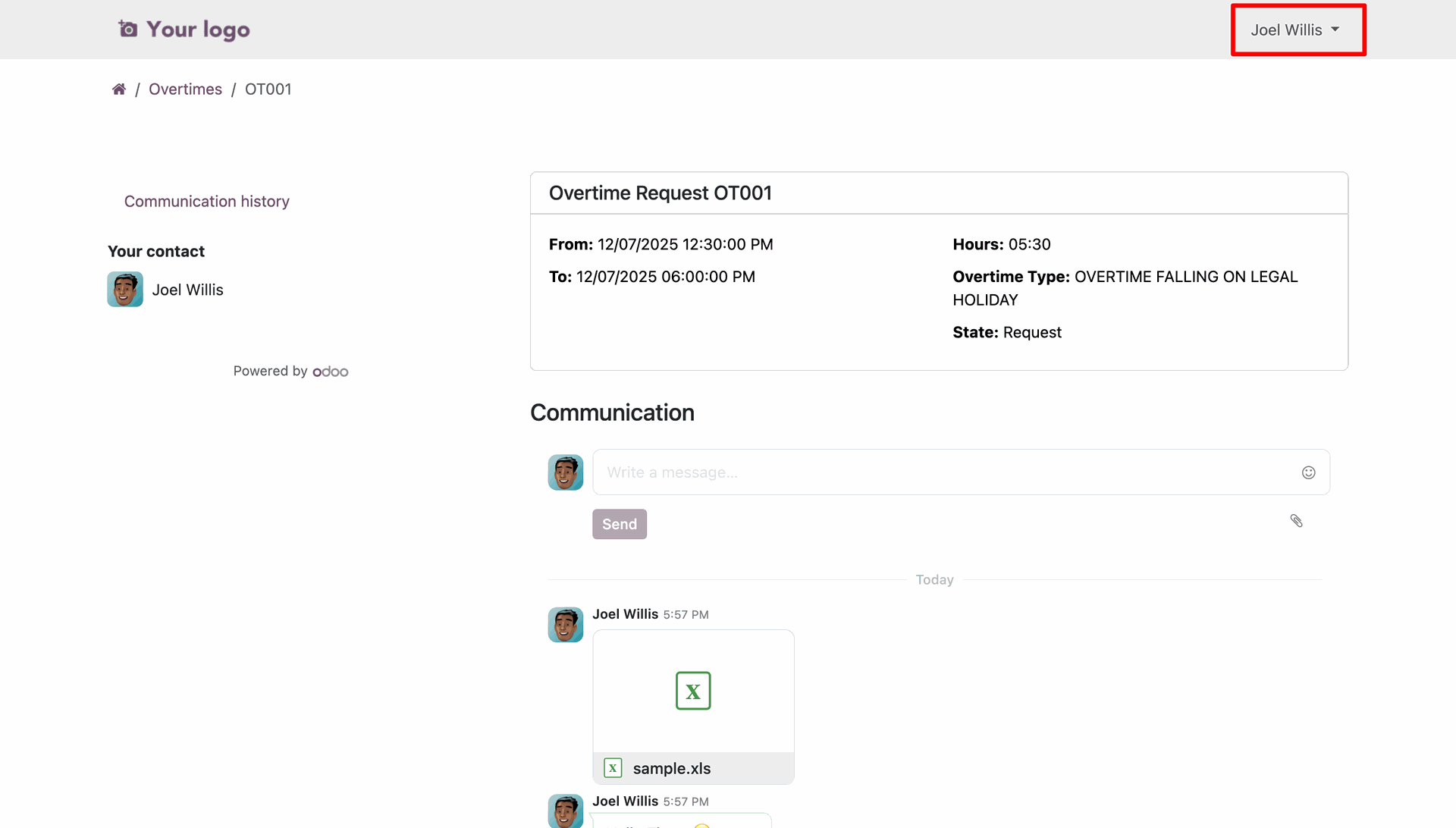 This module enables employees to seamlessly request and track their overtime from the portal. It features an easy-to-use interface for submitting requests with calculated hours, while allowing managers to approve or refuse them directly. The module integrates communication history, supporting different overtime types to streamline the entire management process for both users and administrators.