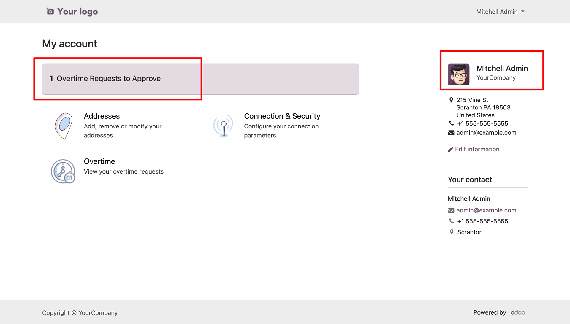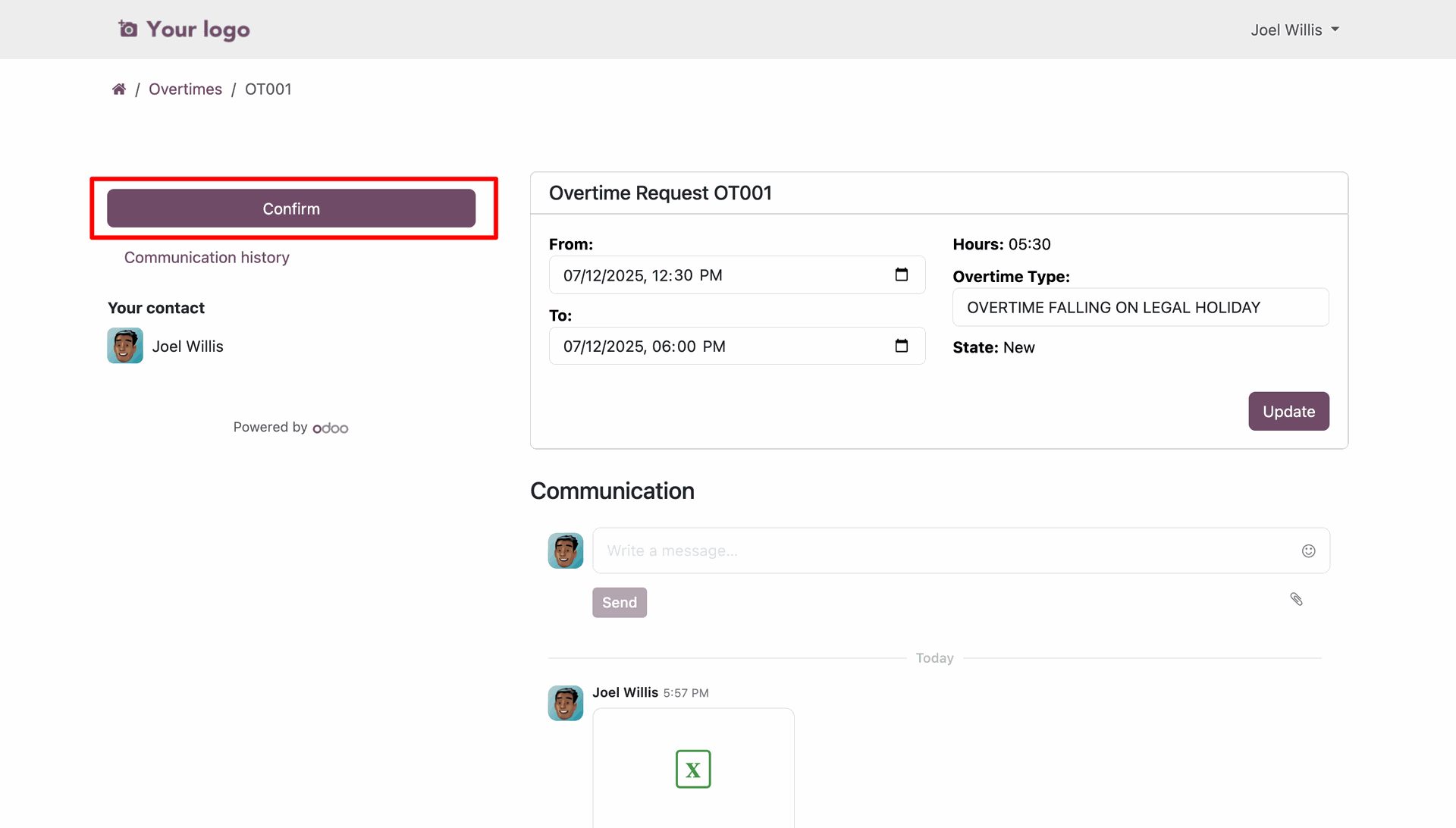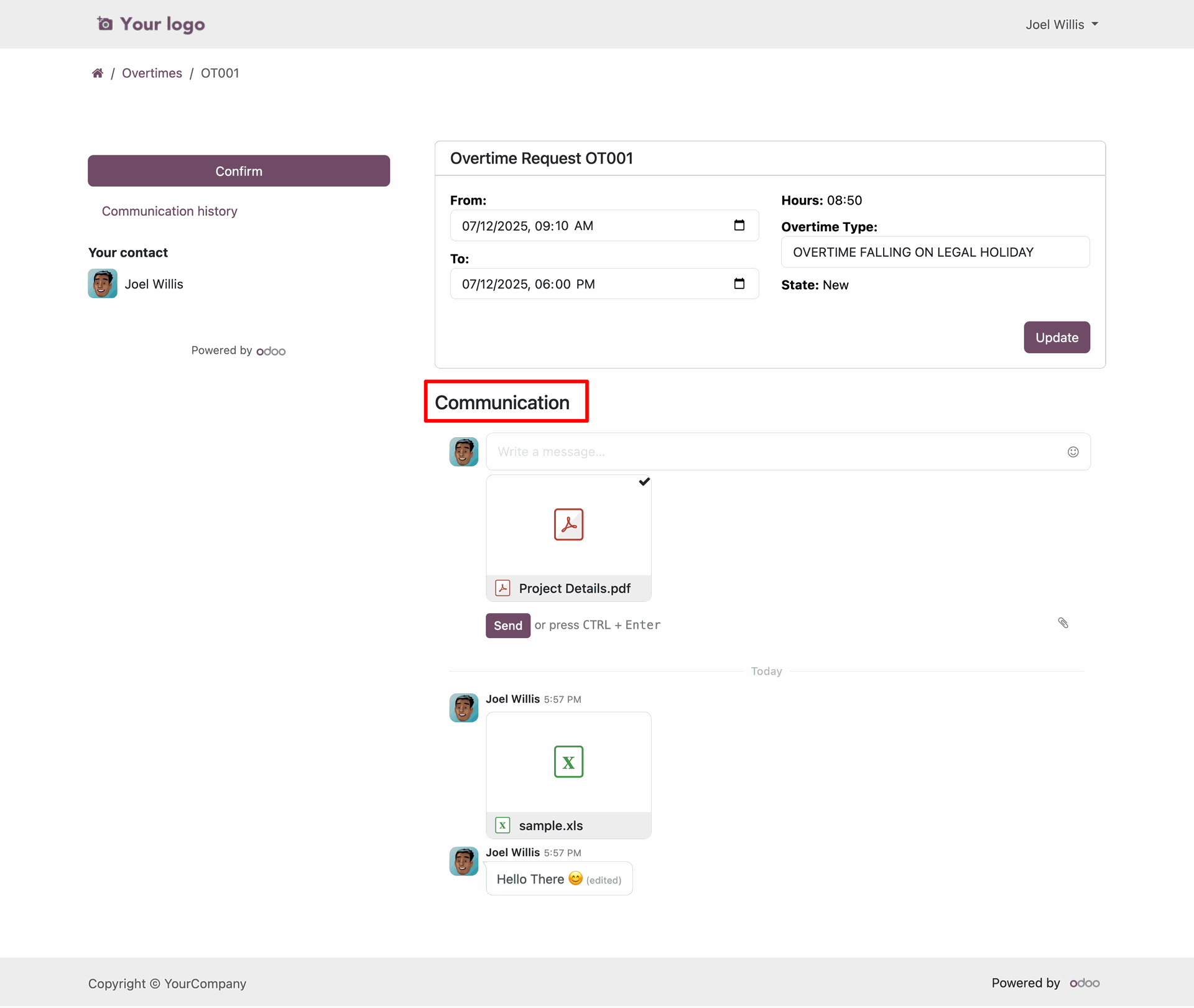 This module enables employees to seamlessly request and track their overtime from the portal. It features an easy-to-use interface for submitting requests with calculated hours, while allowing managers to approve or refuse them directly. The module integrates communication history, supporting different overtime types to streamline the entire management process for both users and administrators.