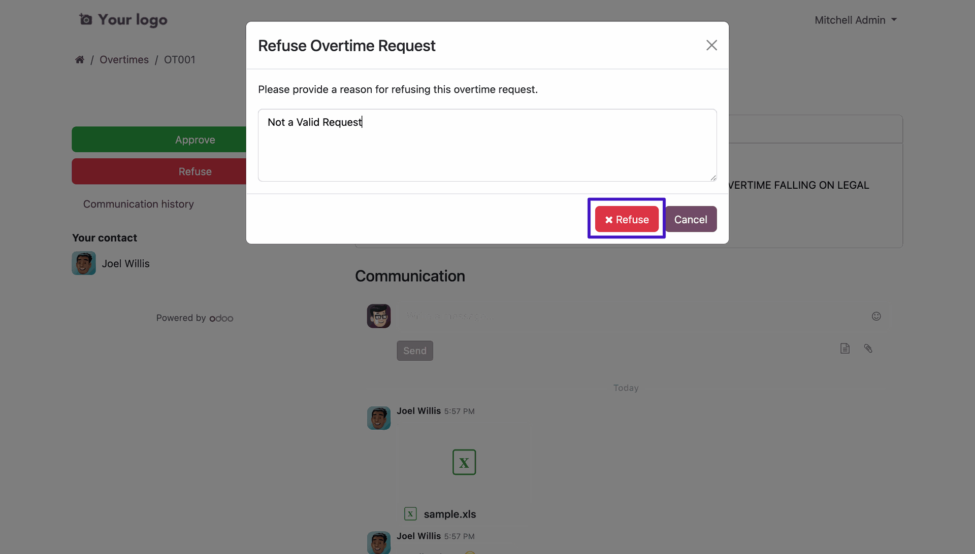A popup allows managers to provide specific reasons when a request needs to be refused.