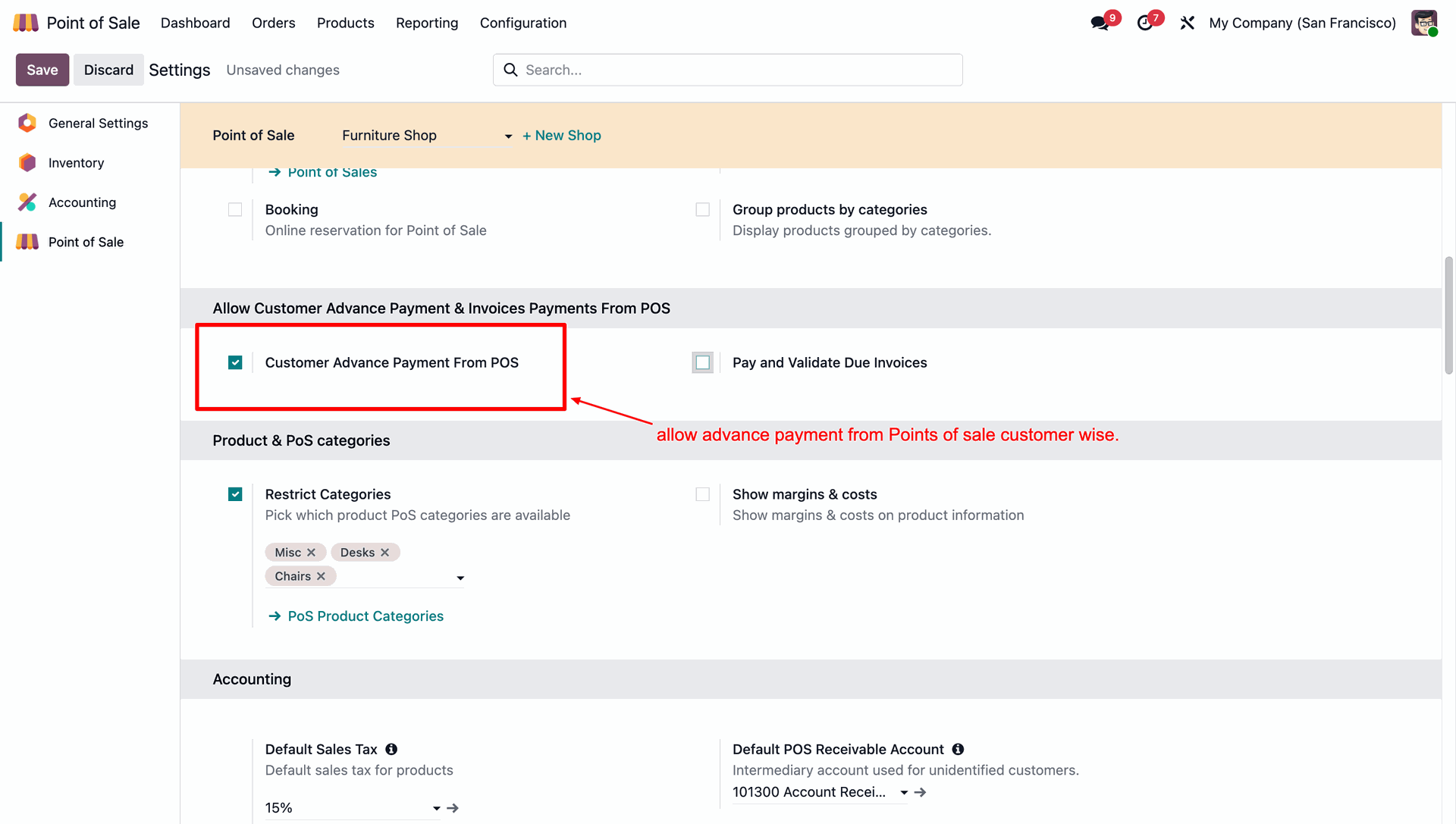 In the POS settings, enable Customer Advance Payment From POS to allow advance payments to be recorded at the point of sale.