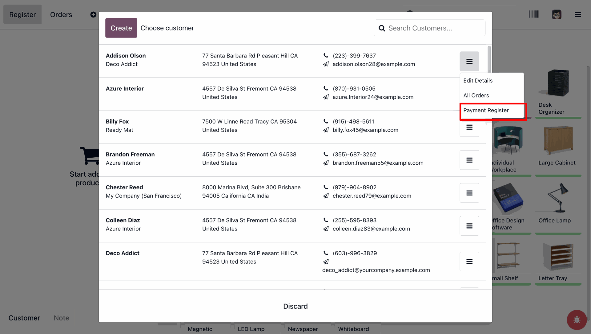 Open the customer options menu and select Payment Register to record a payment for that specific client.