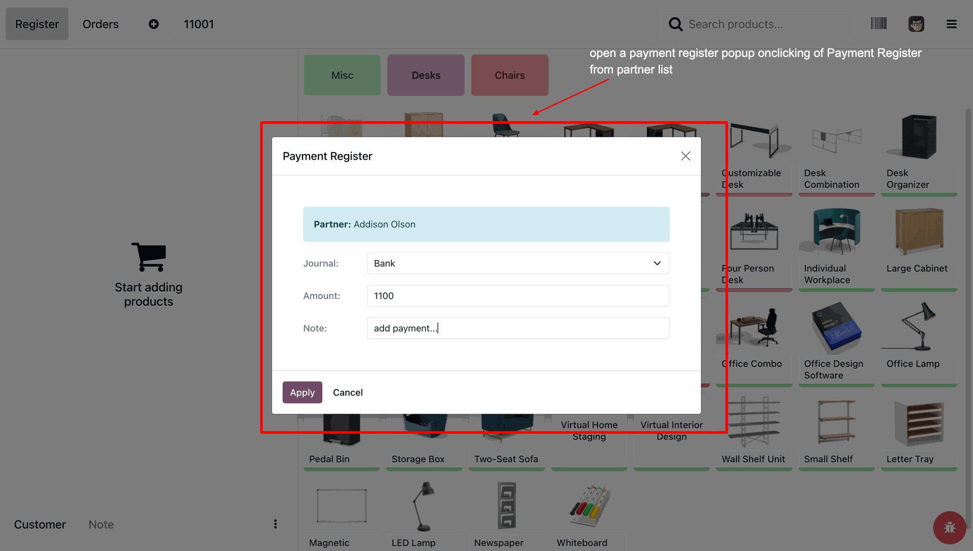 Fill in the Journal, Amount, and Note fields within the pop-up, then click Apply to successfully register the customer's payment.