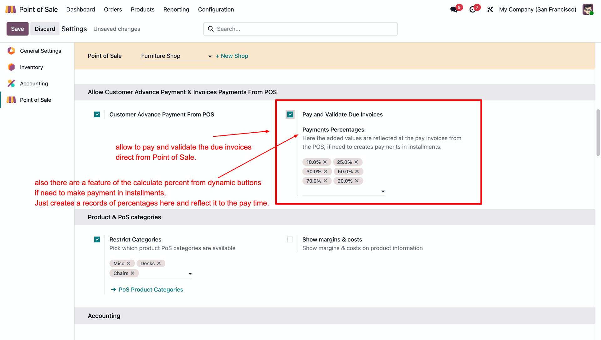 Enable Pay and Validate Due Invoices to settle bills in POS, and configure Payment Percentages to create quick-action buttons for installment payments.