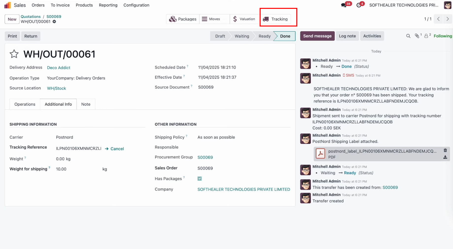 The delivery order with details. It displays the Shipping Information under the Additional Info tab after generating the label. In the log note, it shows that the shipping label was successfully generated, along with a downloadable PDF link.