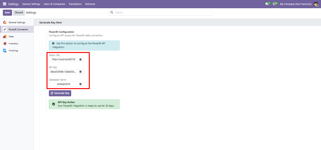 Quickly generate the Odoo URL and API key required for Power BI authentication.